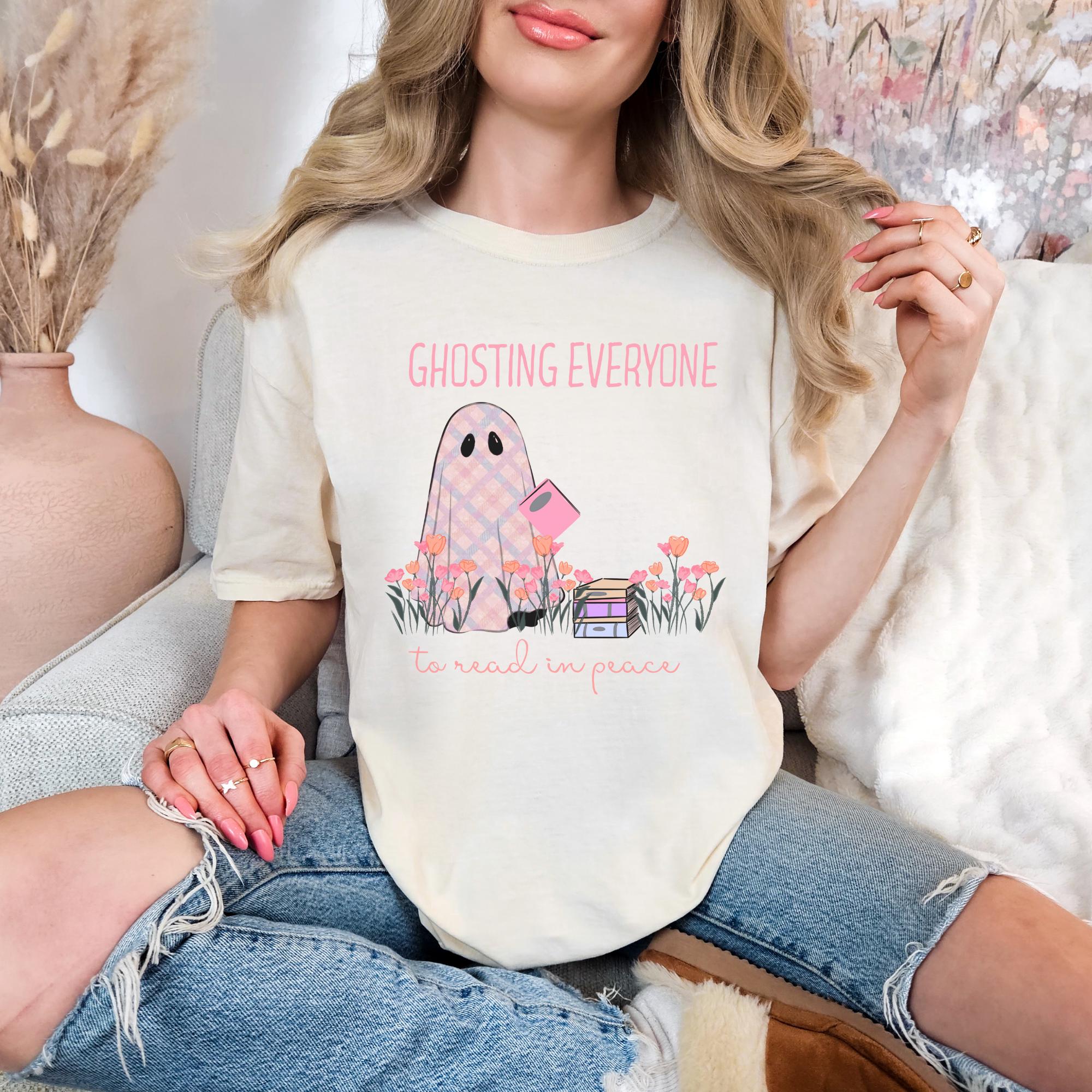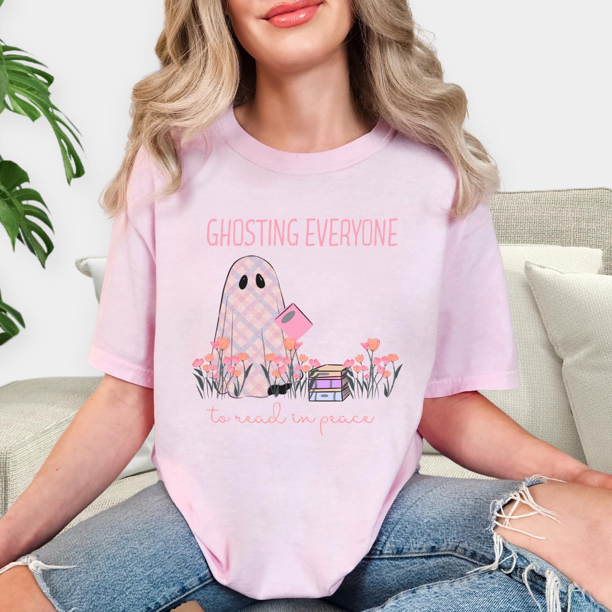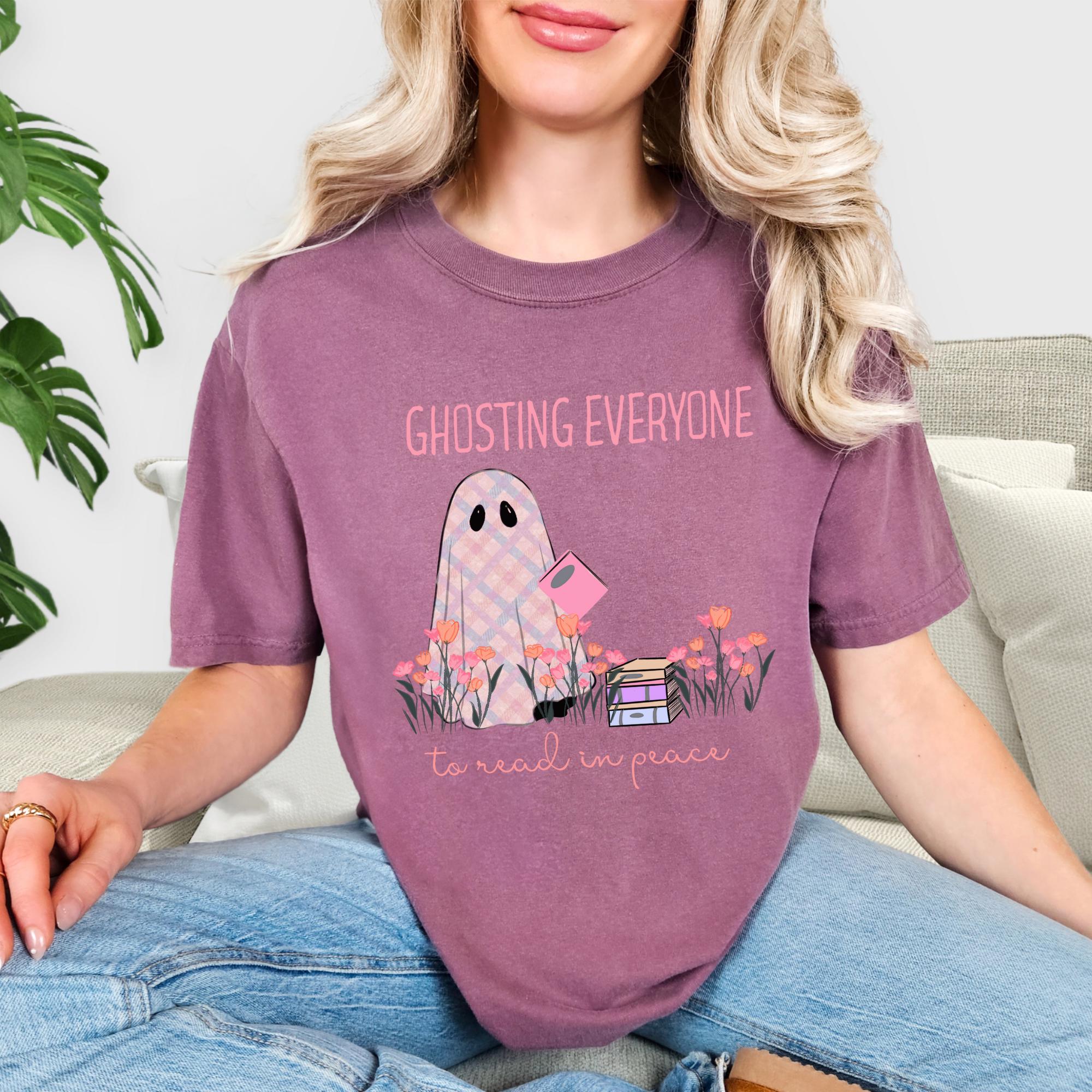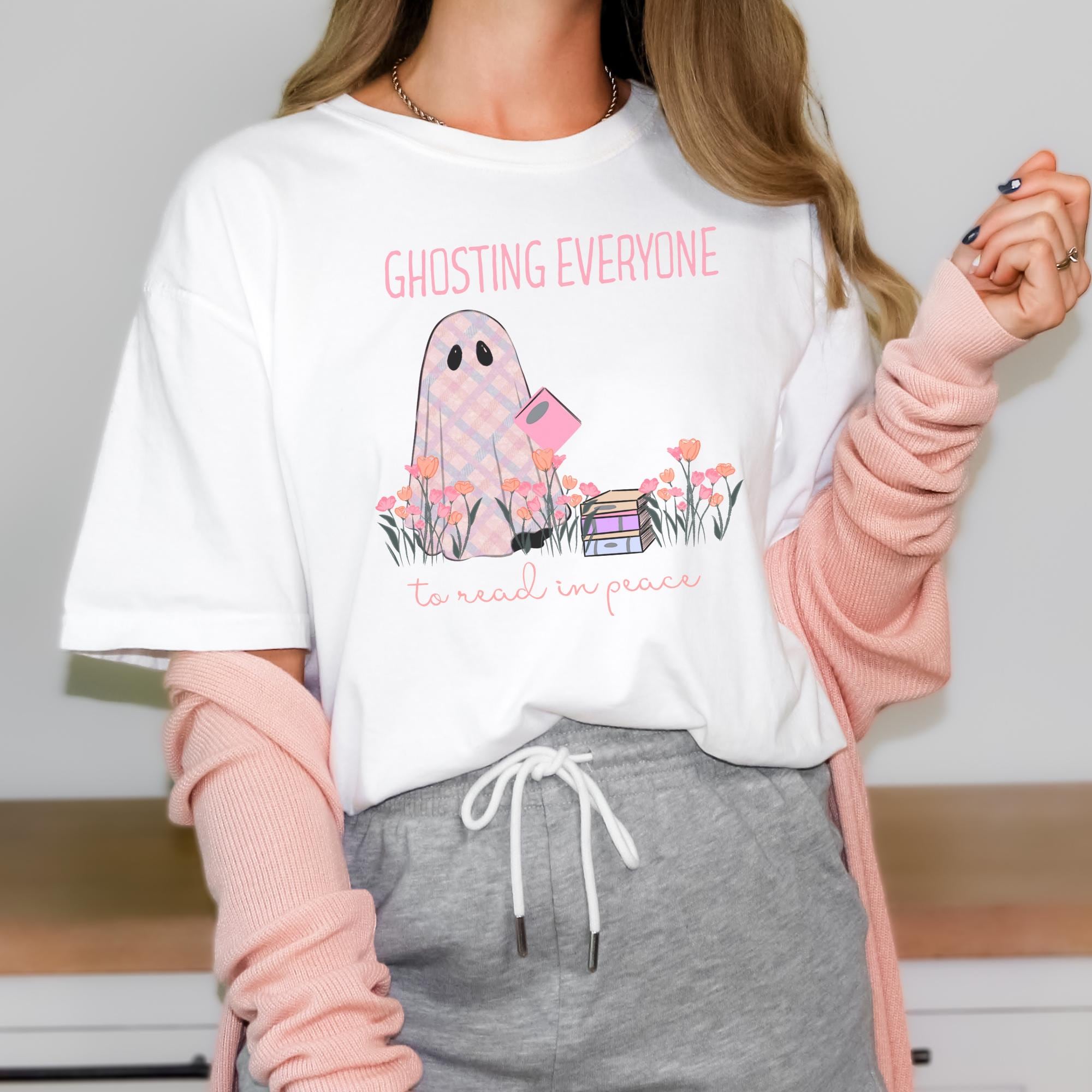 Cozy up with a good book and a little humor in this Ghosting Everyone To Read in Peace tee! Featuring an adorable pastel ghost with a plaid blanket, pink book, and flowers, this shirt is perfect for book lovers who enjoy a quiet night in. The design is both spooky-cute and bookish, making it a great everyday tee for fall, Halloween, or year-round reading vibes.