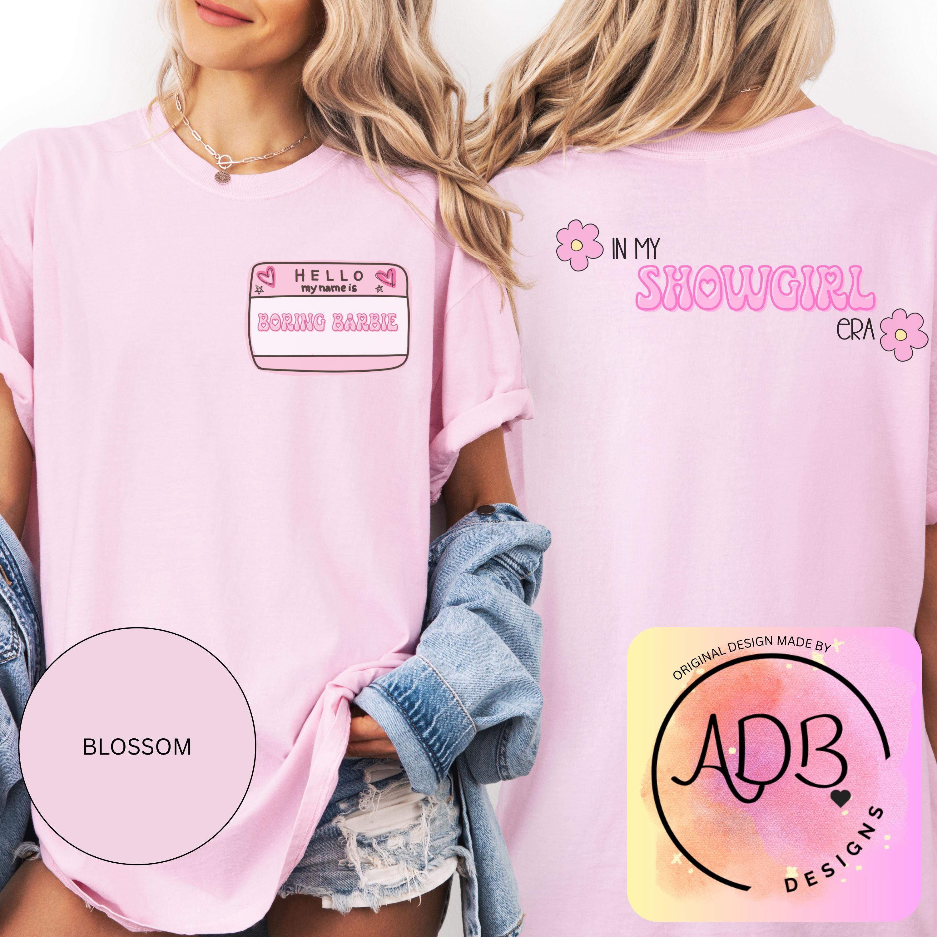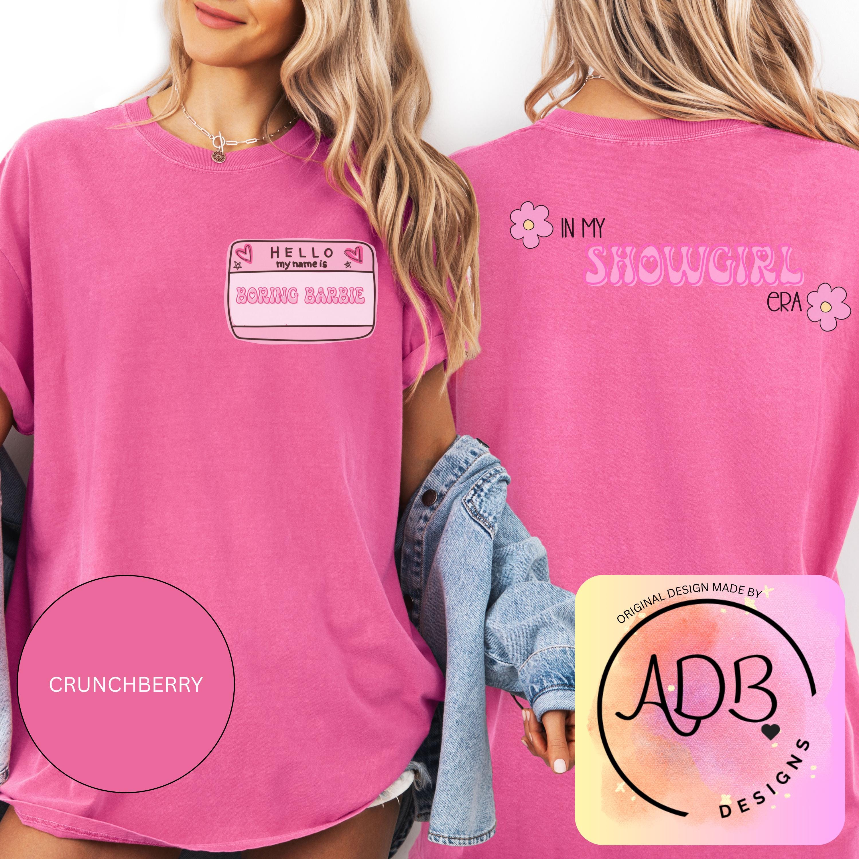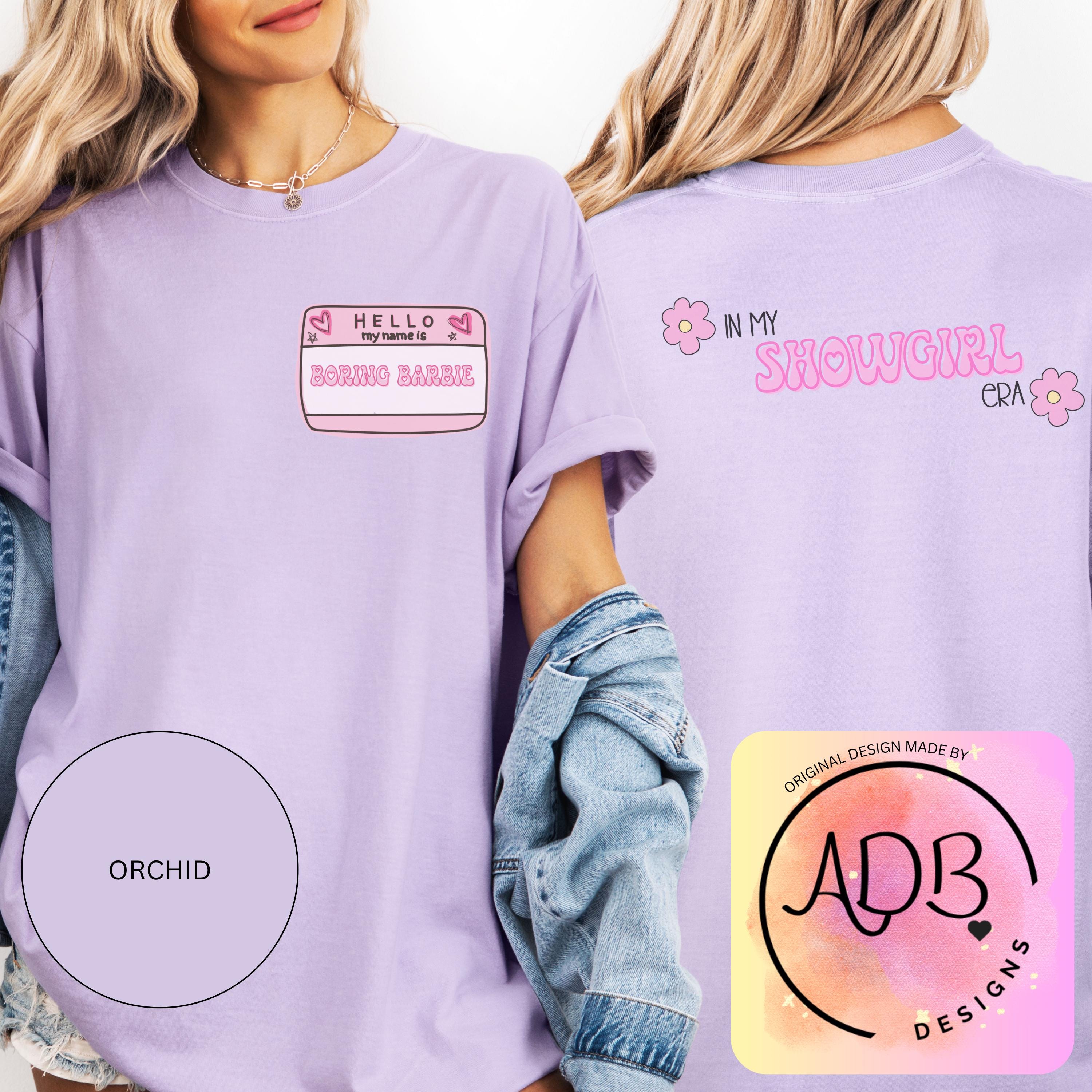 This soft orchid Comfort Colors tee features a playful front name tag that reads “Hello My Name Is Boring Barbie” and a cute retro-style back print that says “In My Showgirl Era” with little flower details. It’s the perfect mix of girly, witty, and confident — made for the Barbie who’s anything but boring.
