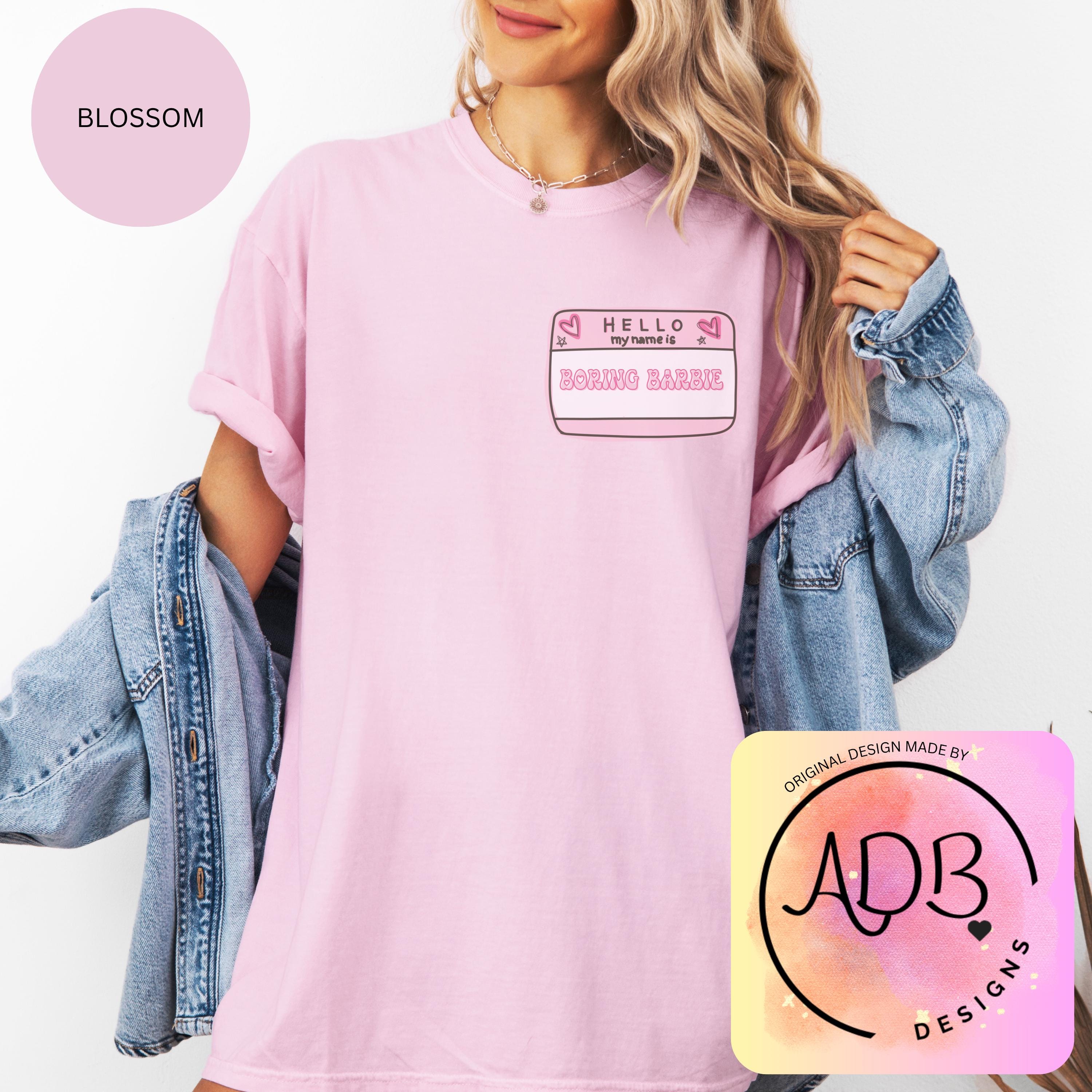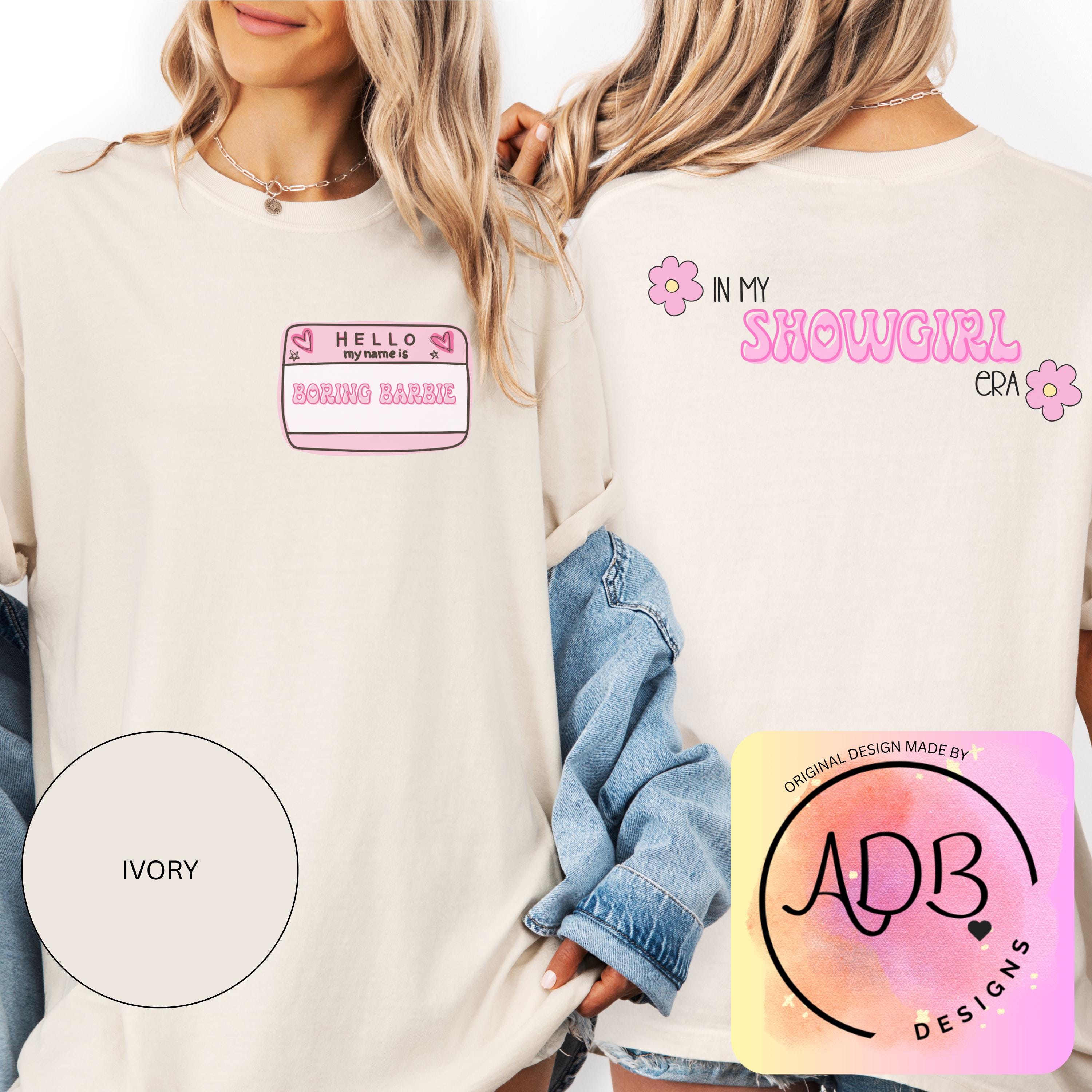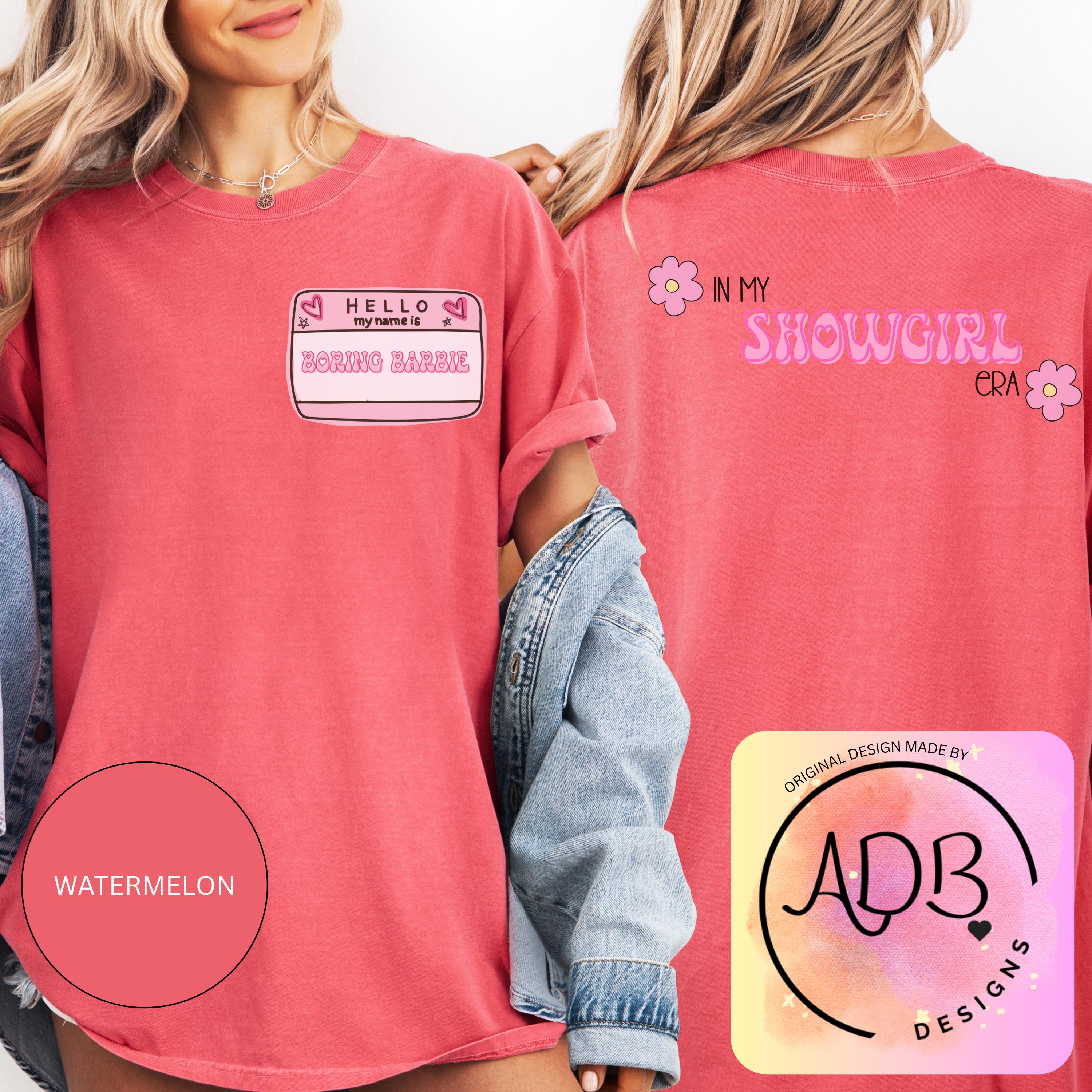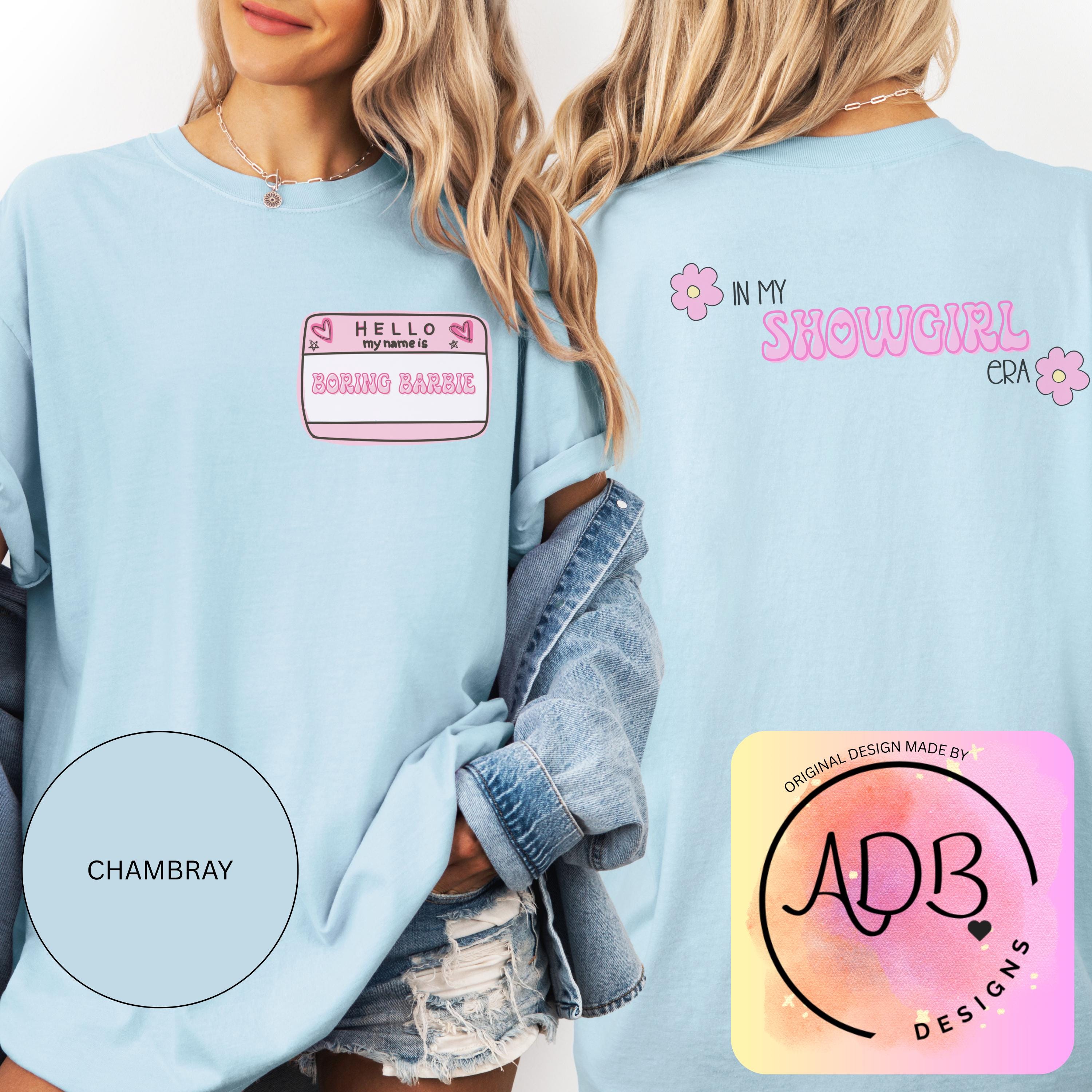 This soft orchid Comfort Colors tee features a playful front name tag that reads “Hello My Name Is Boring Barbie” and a cute retro-style back print that says “In My Showgirl Era” with little flower details. It’s the perfect mix of girly, witty, and confident — made for the Barbie who’s anything but boring.