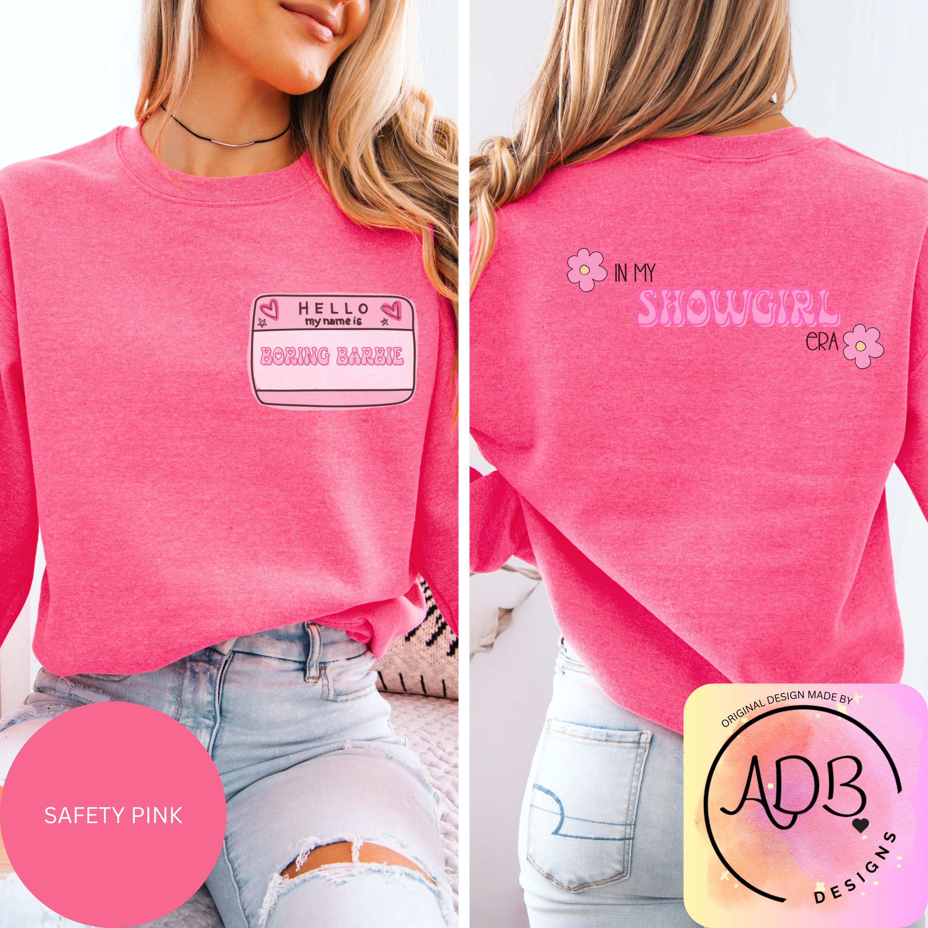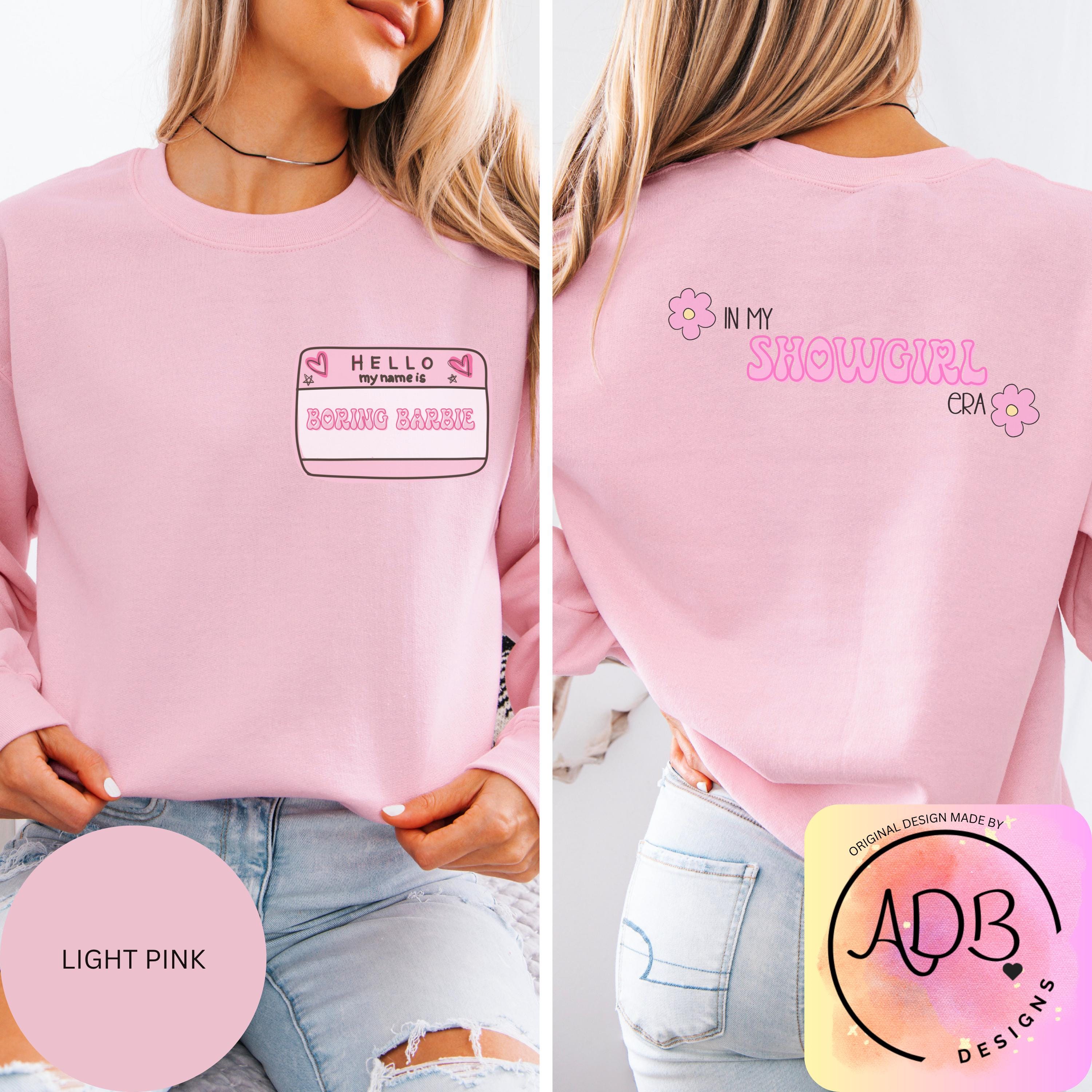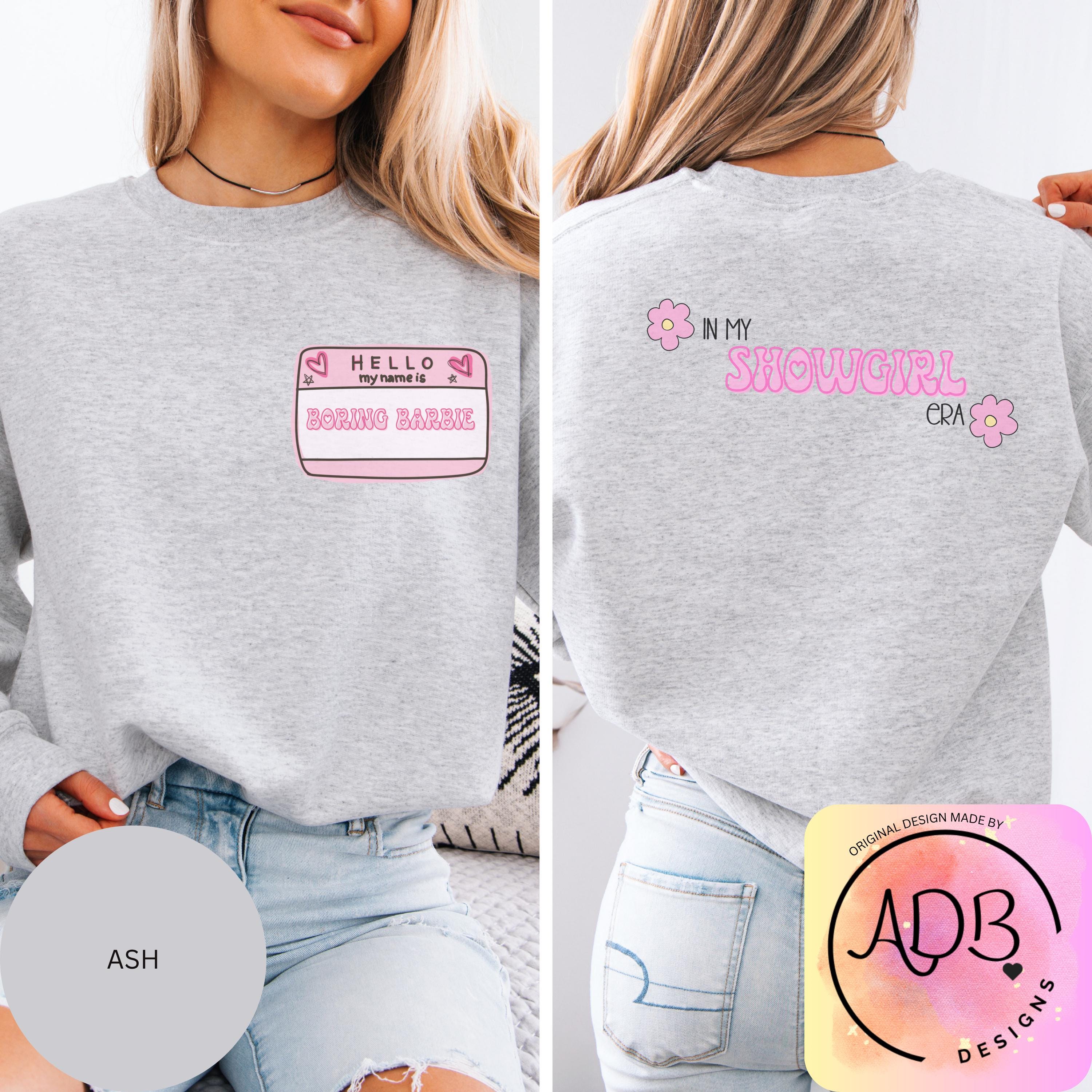 This soft sweatshirt features a playful front name tag that reads “Hello My Name Is Boring Barbie” and a cute retro-style back print that says “In My Showgirl Era” with little flower details. It’s the perfect mix of girly, witty, and confident — made for the Barbie who’s anything but boring.