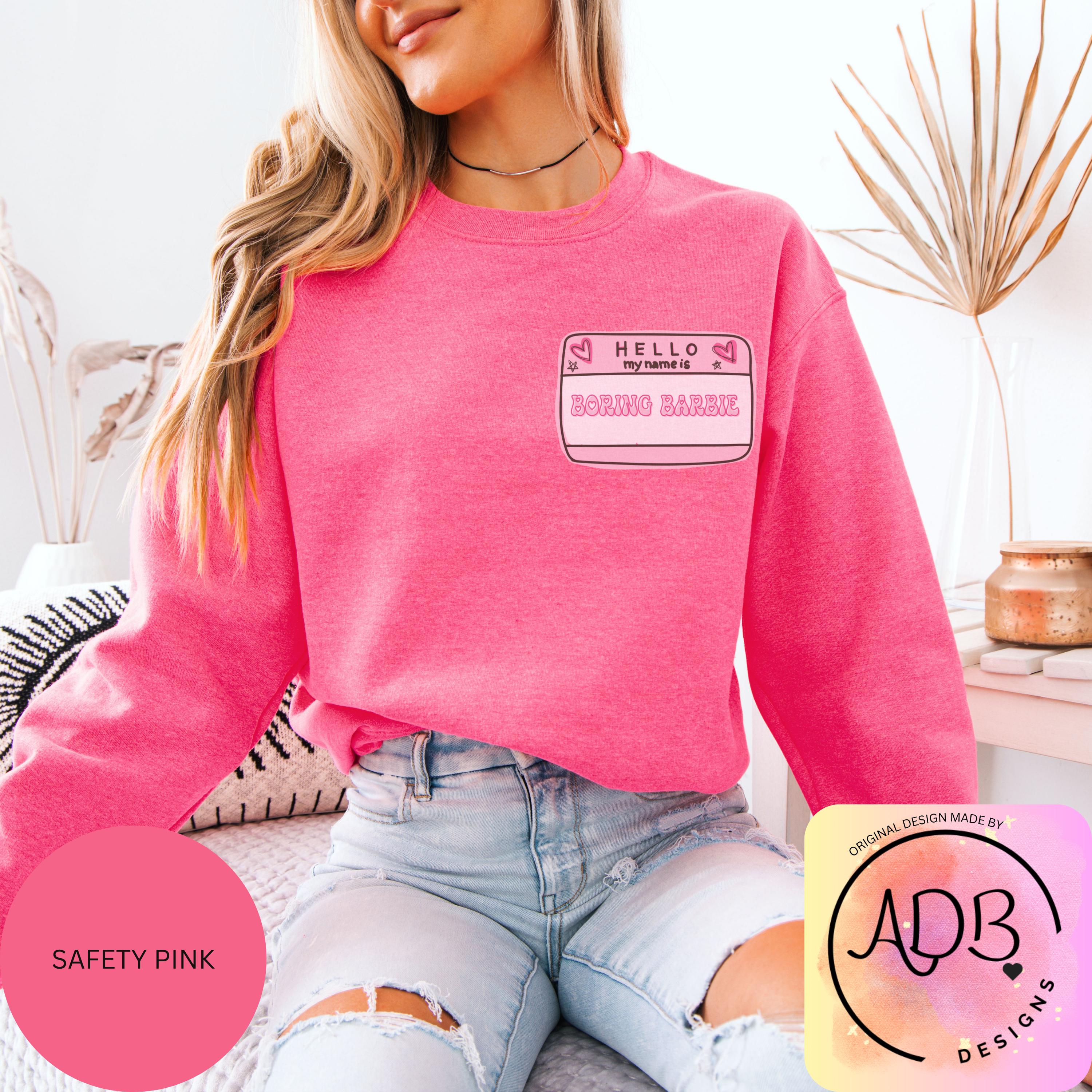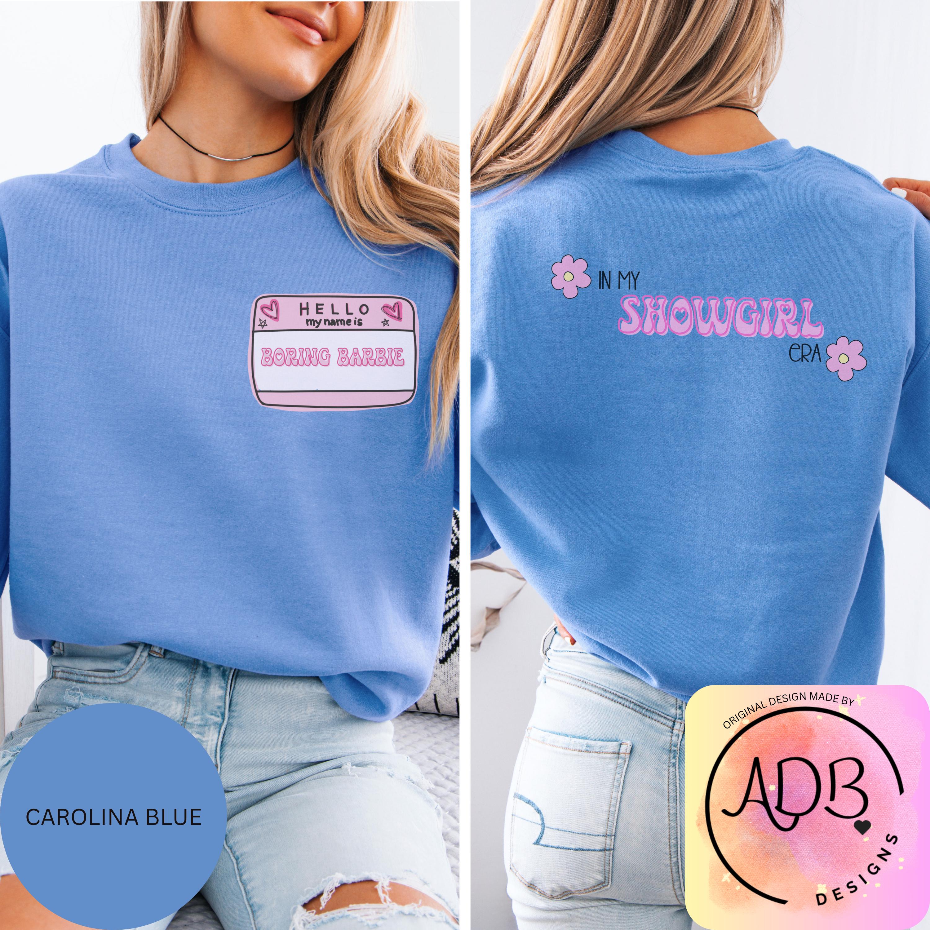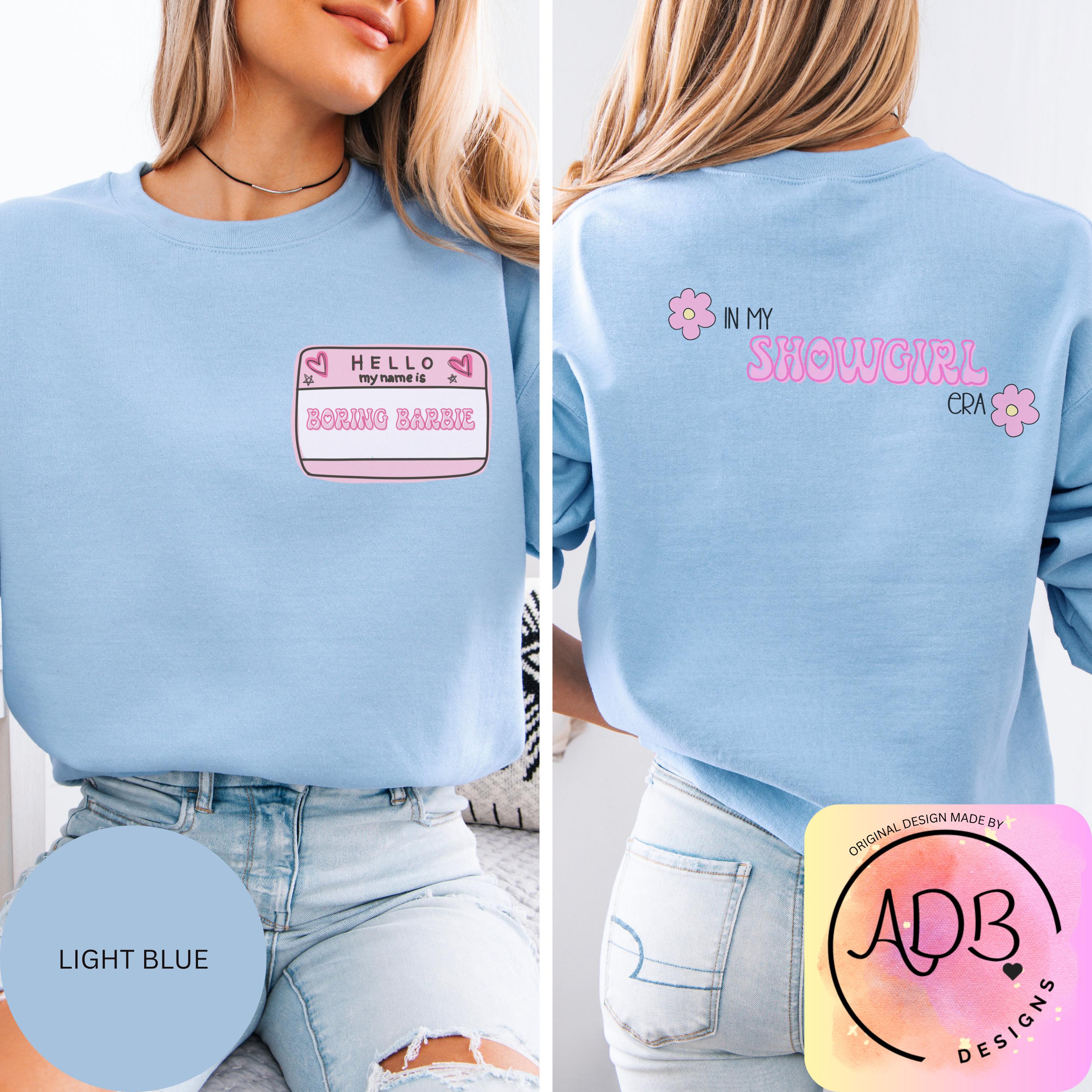 This soft sweatshirt features a playful front name tag that reads “Hello My Name Is Boring Barbie” and a cute retro-style back print that says “In My Showgirl Era” with little flower details. It’s the perfect mix of girly, witty, and confident — made for the Barbie who’s anything but boring.