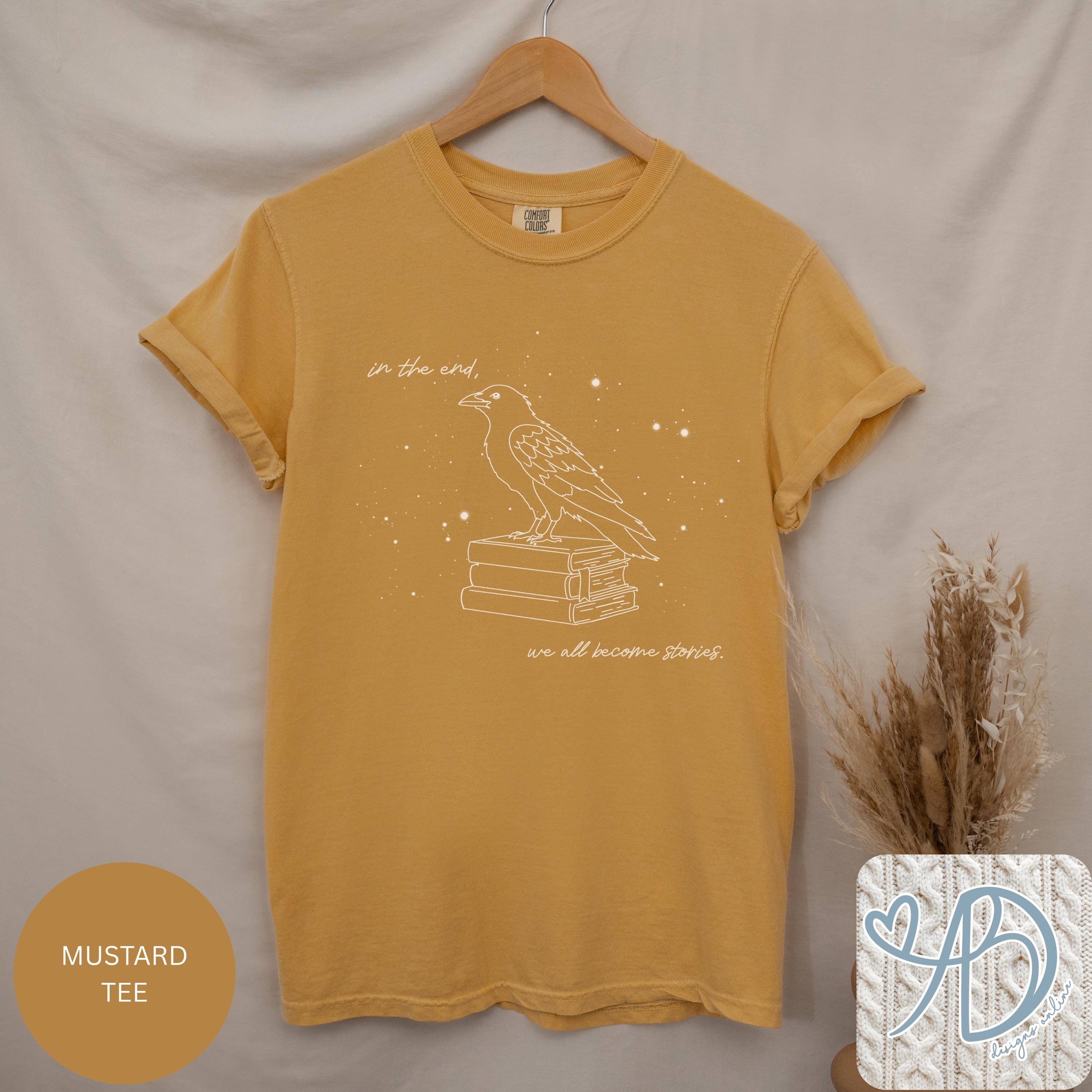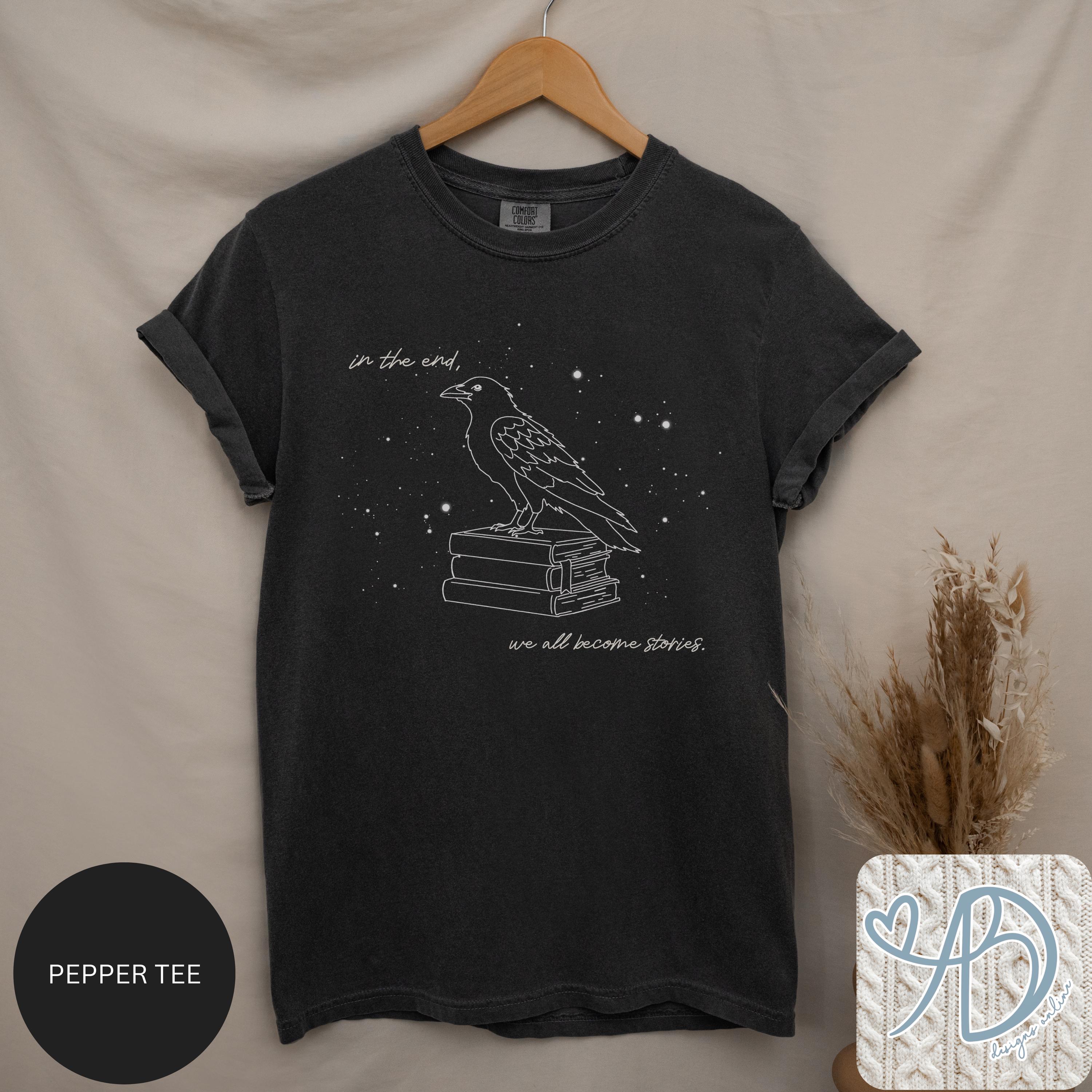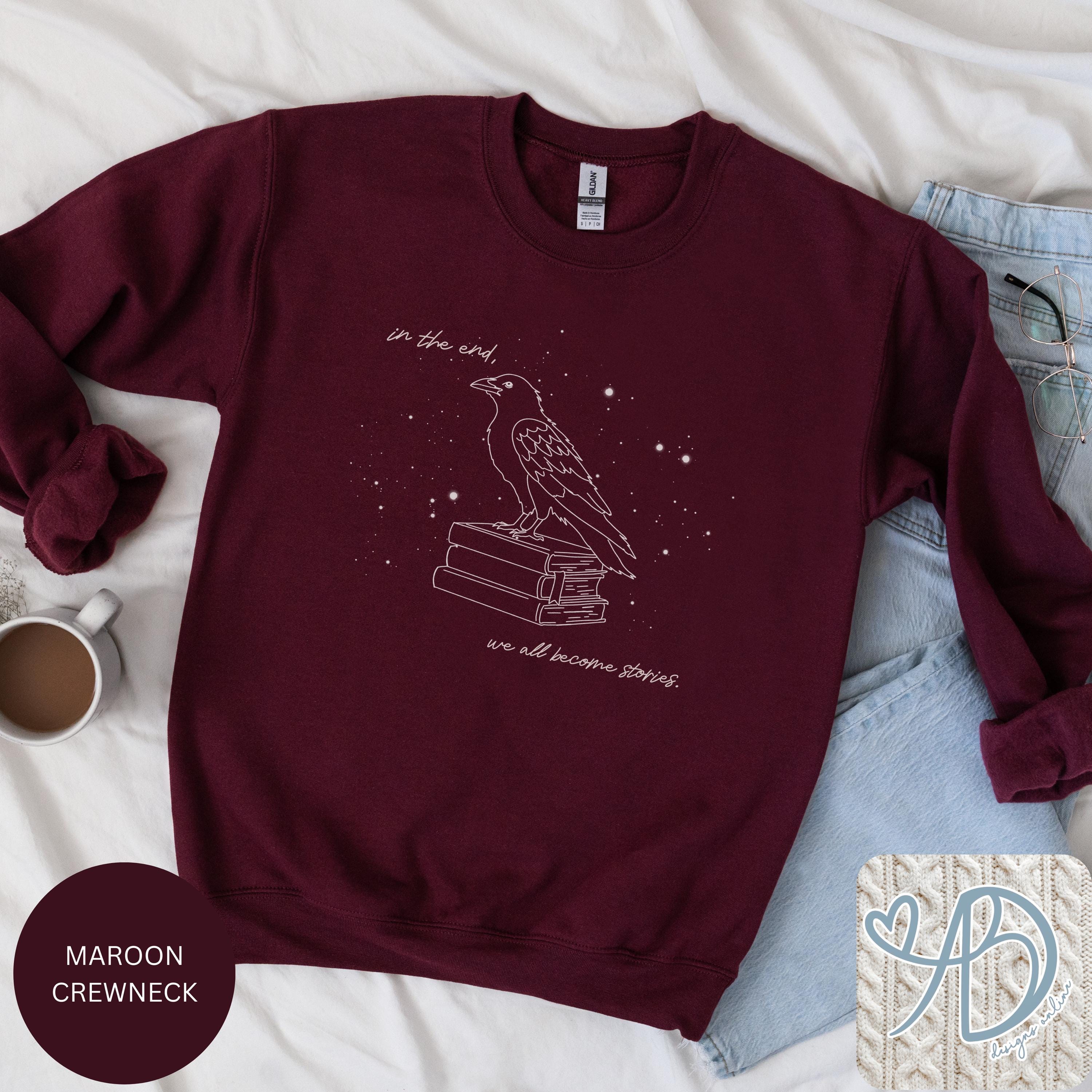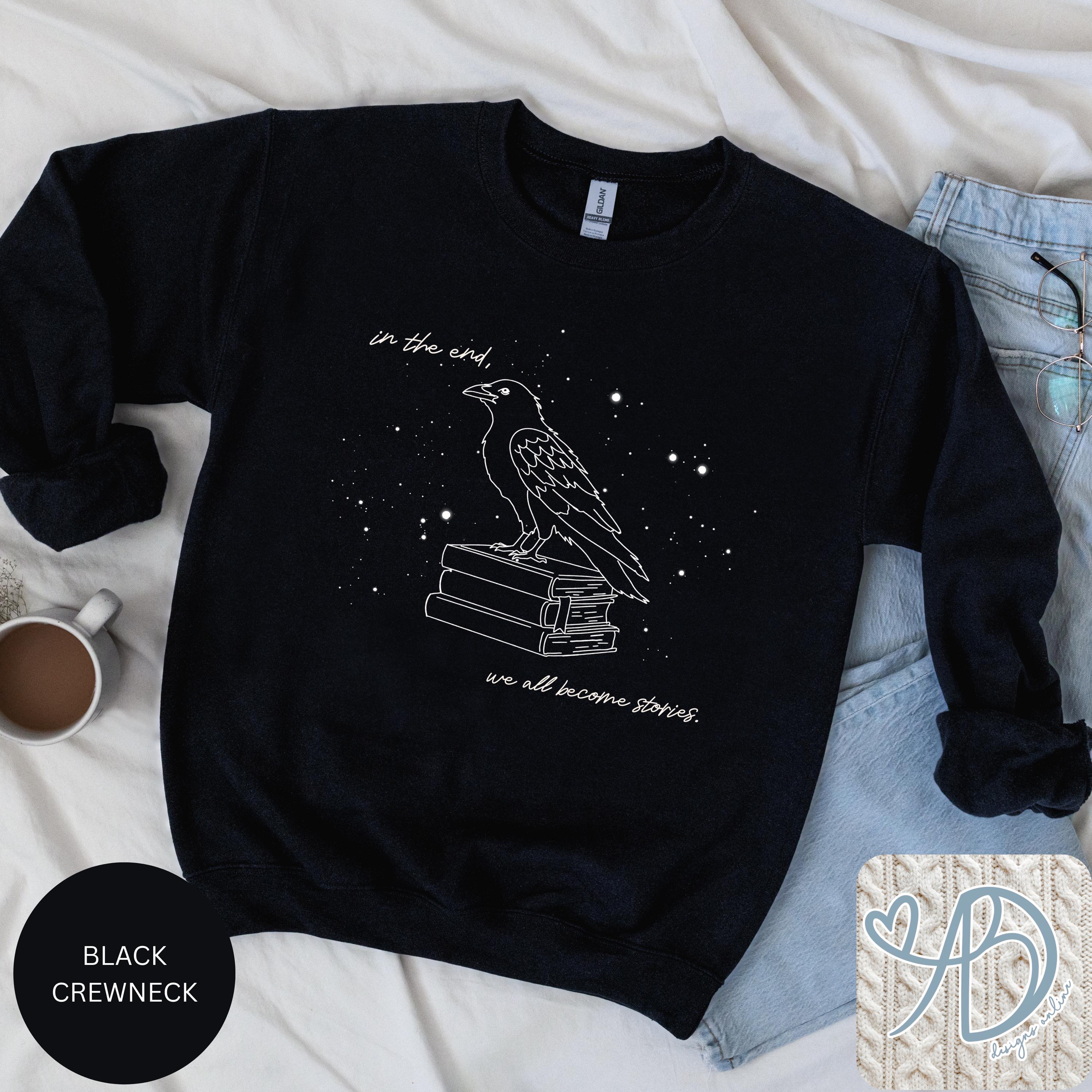 This cozy black crewneck features a hand-drawn raven perched on a stack of books, surrounded by soft starry details and an introspective literary quote. Designed for readers, writers, and anyone who believes stories shape who we are.