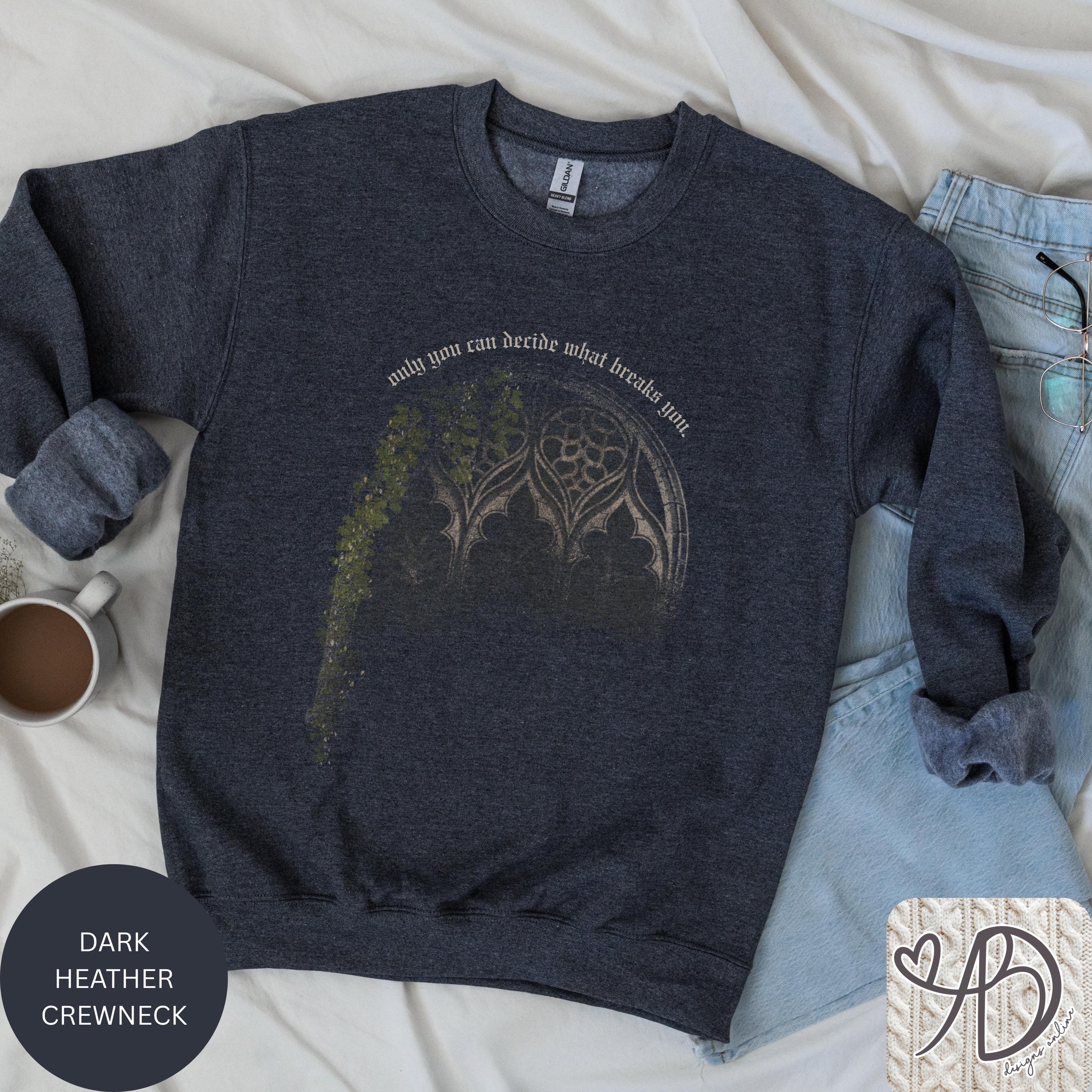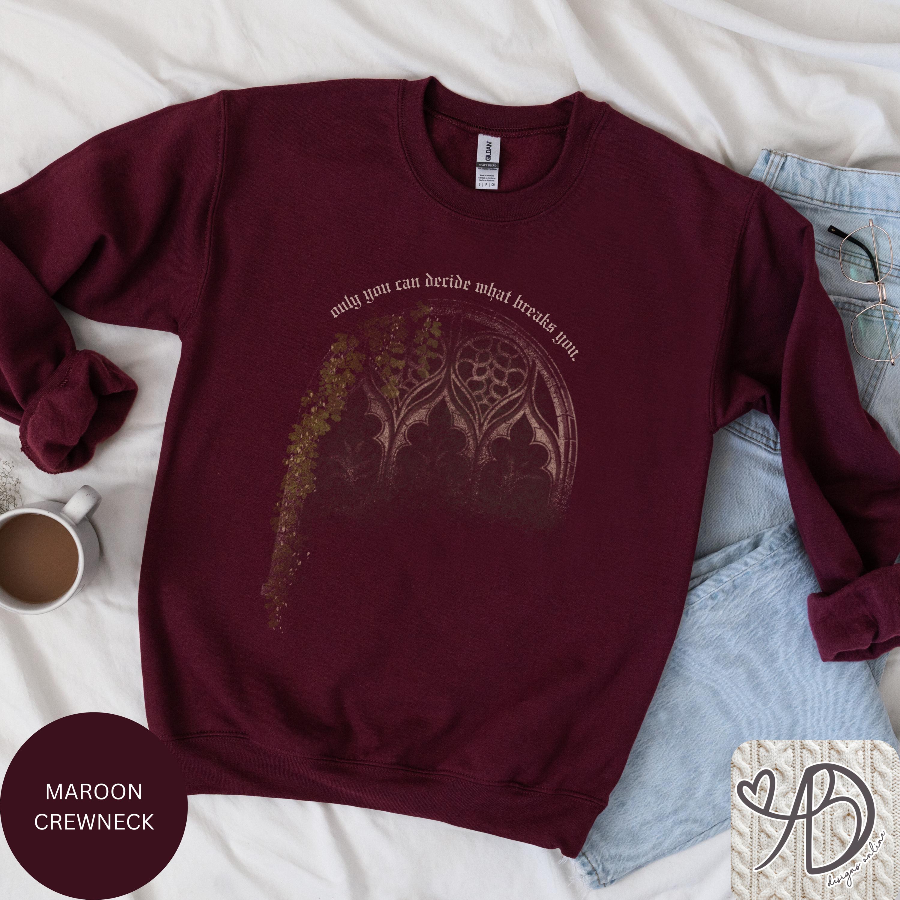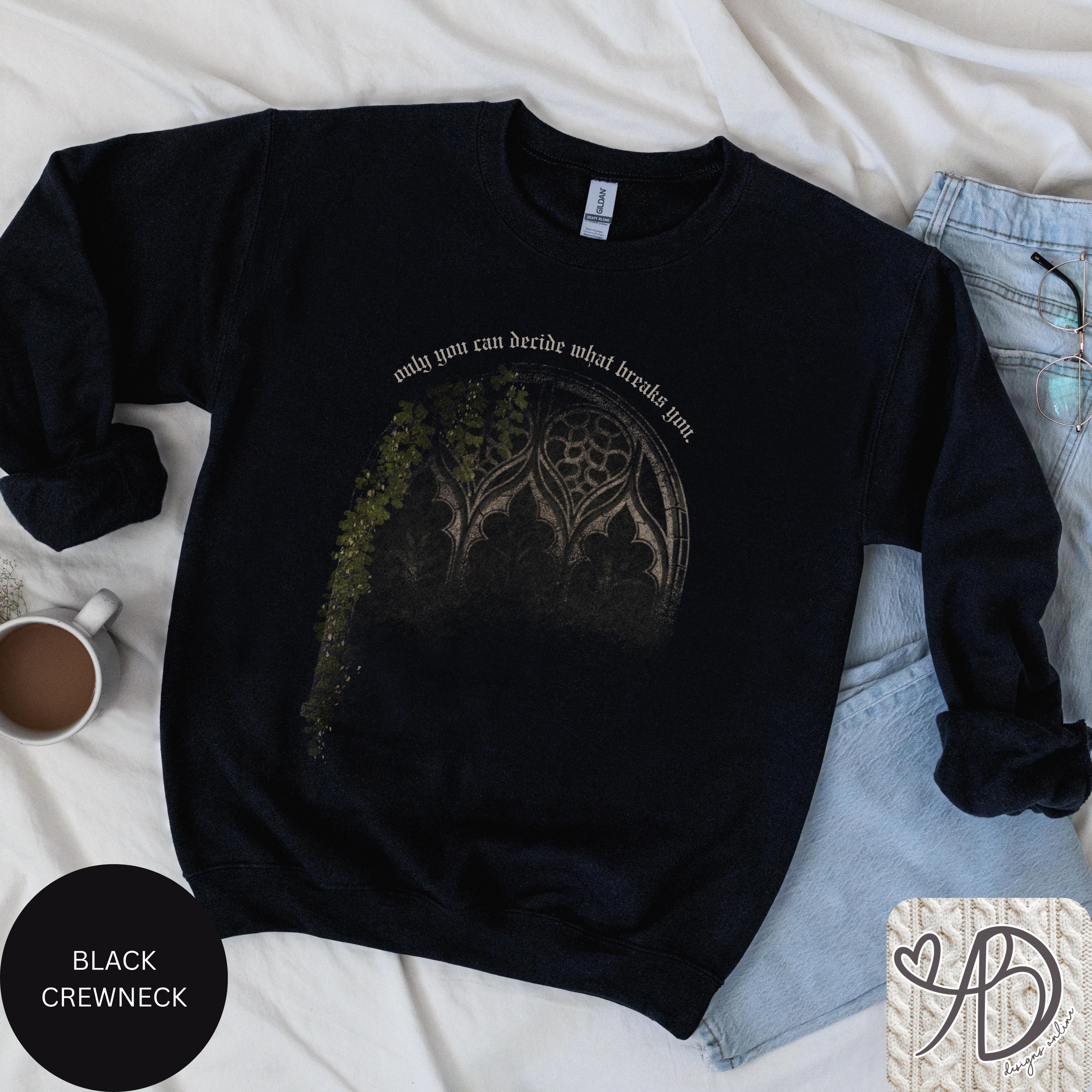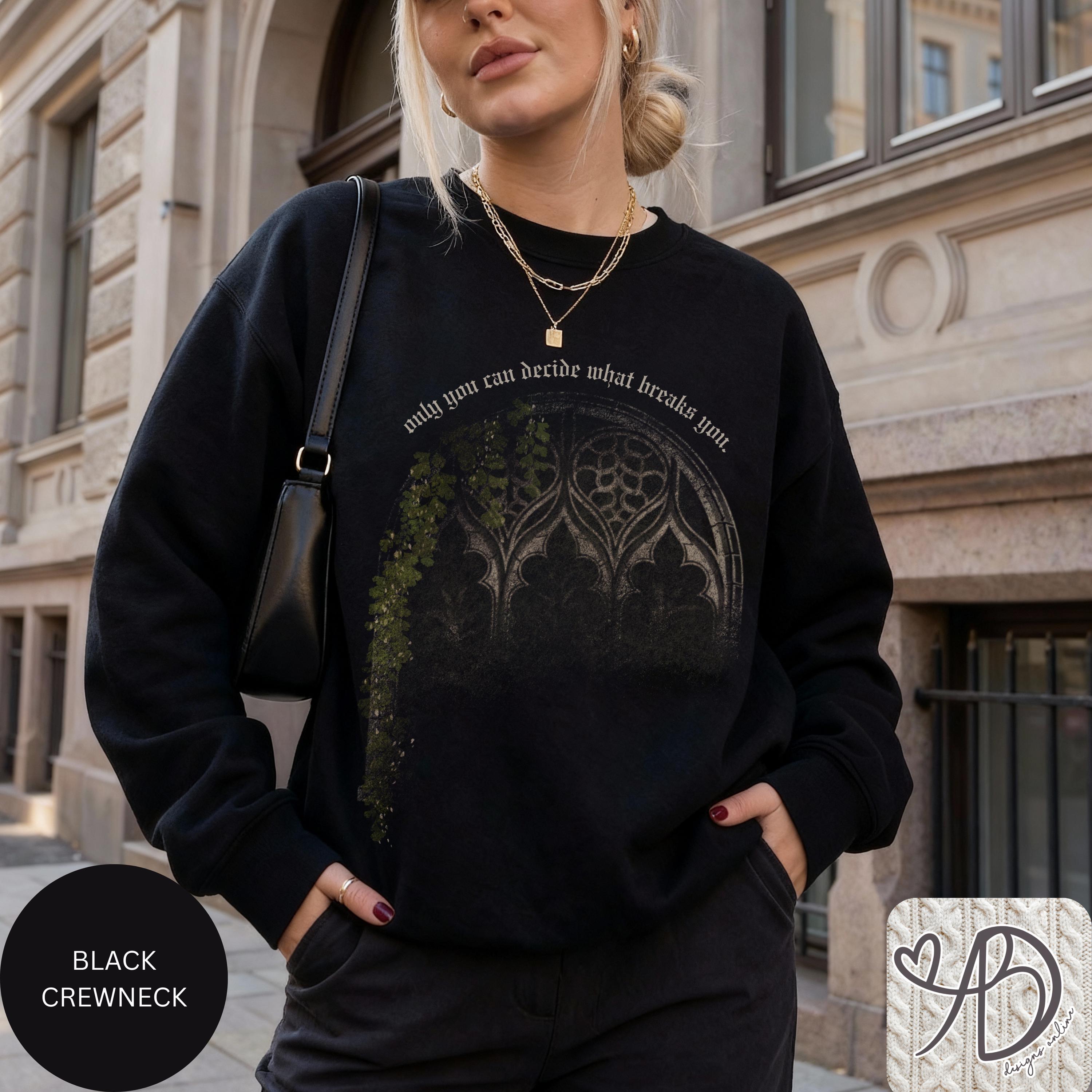 This dark academia graphic shirt and sweatshirt features an original hand-drawn gothic window design paired with the phrase “Only You Can Decide What Breaks You.” Inspired by resilience, introspection, and quiet strength, this piece is perfect for readers, creatives, and lovers of moody, literary aesthetics.
