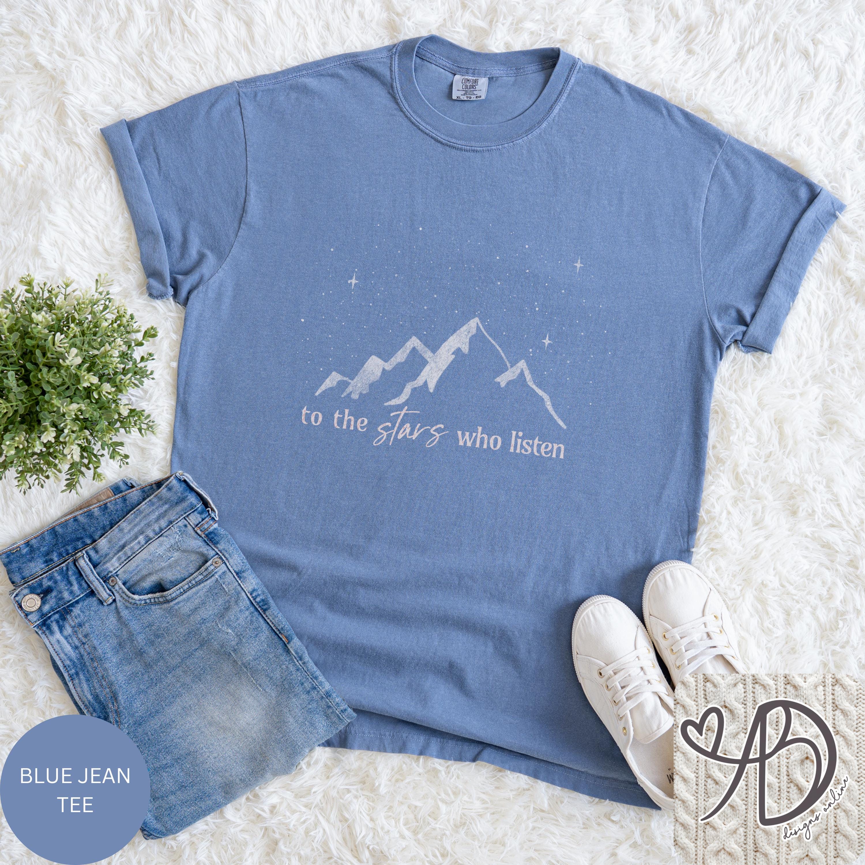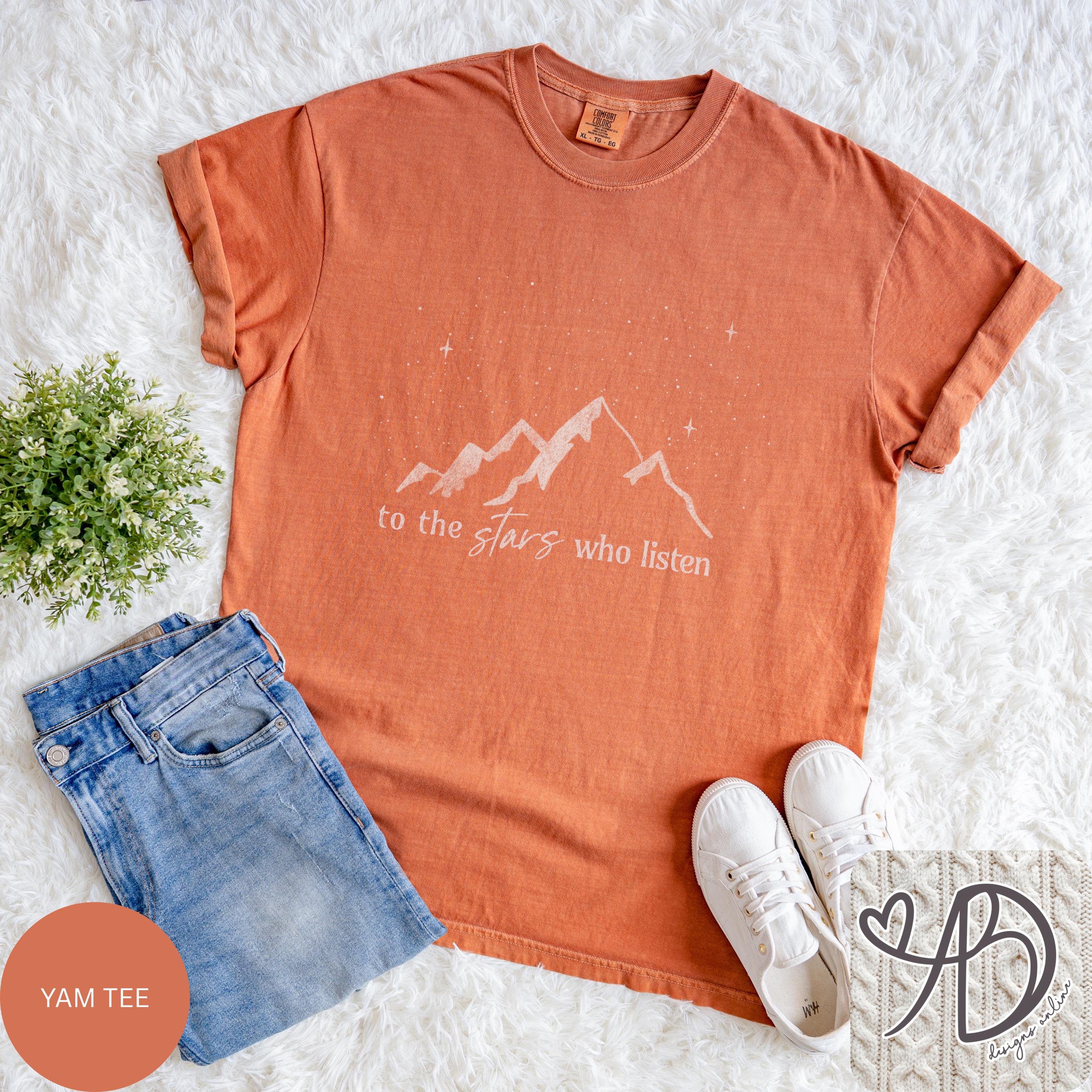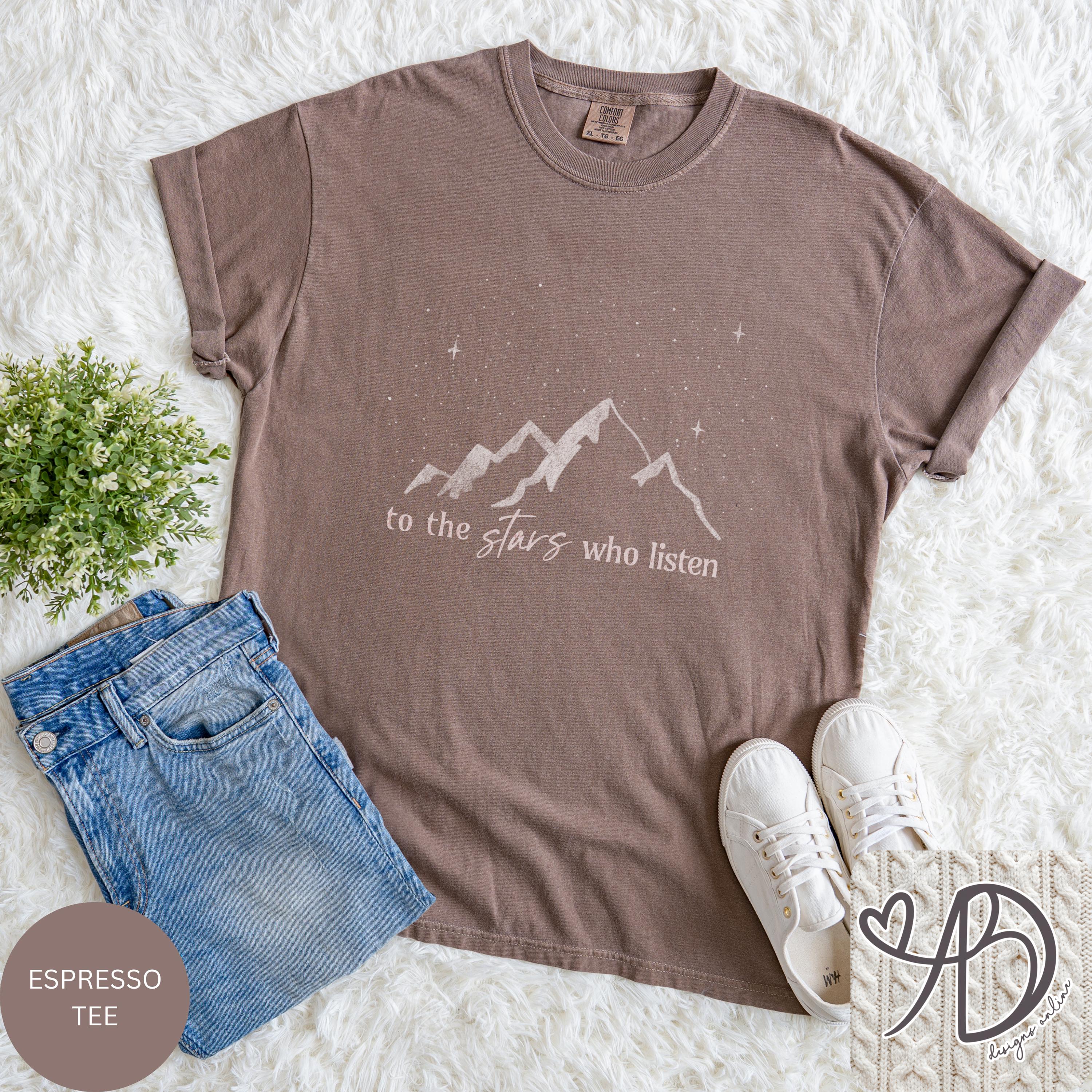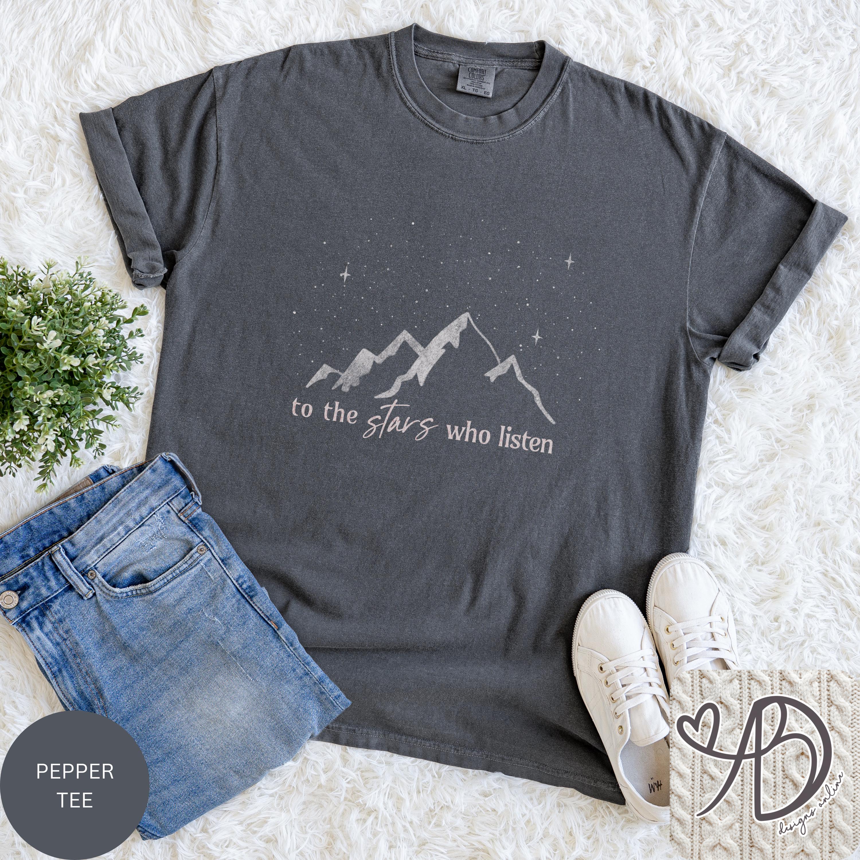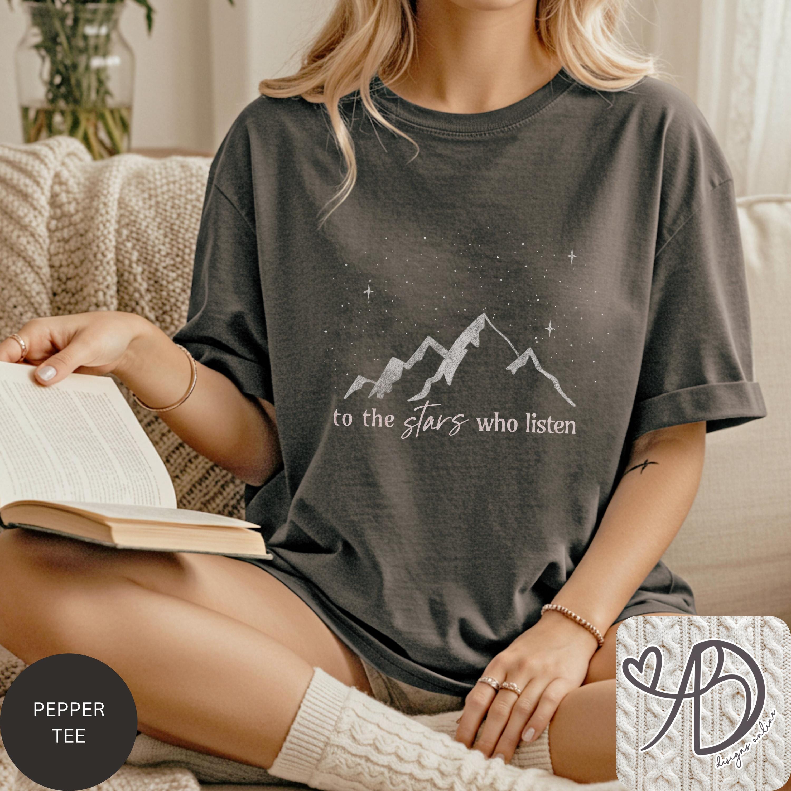 This fantasy-inspired bookish shirt features an original hand-drawn celestial mountain design paired with the beloved phrase “to the stars who listen” — a subtle nod for romantic fantasy readers who know exactly what it means 💫