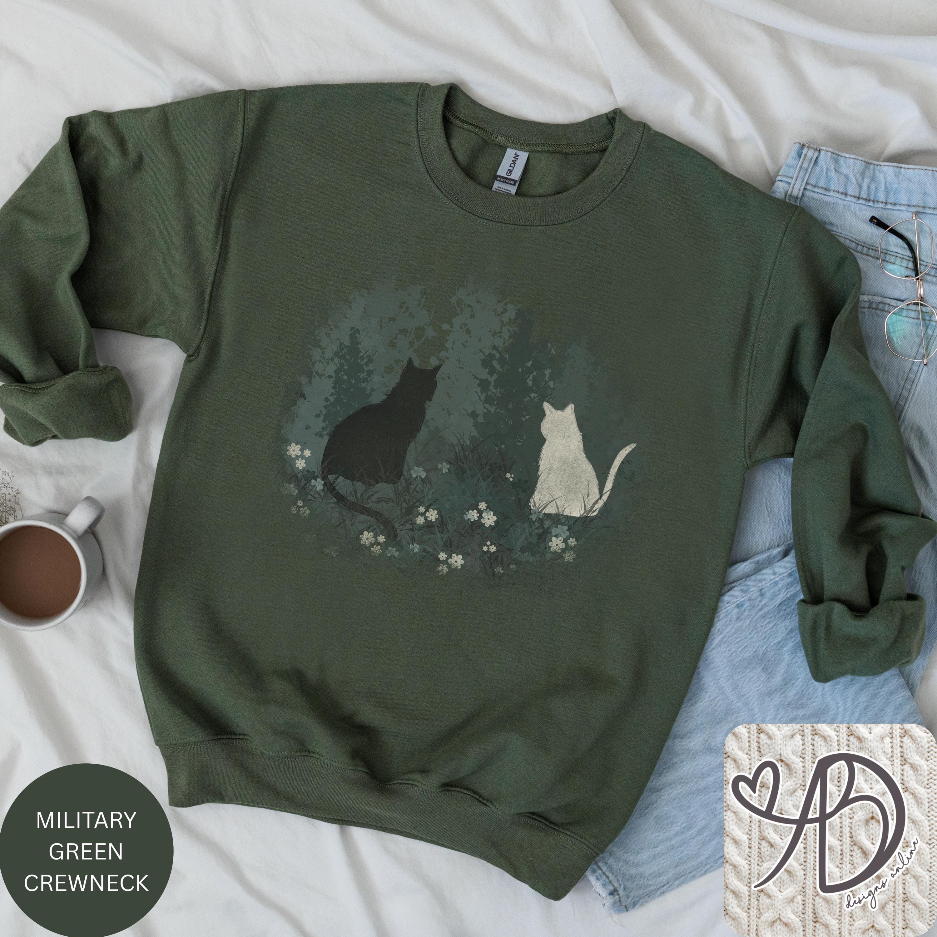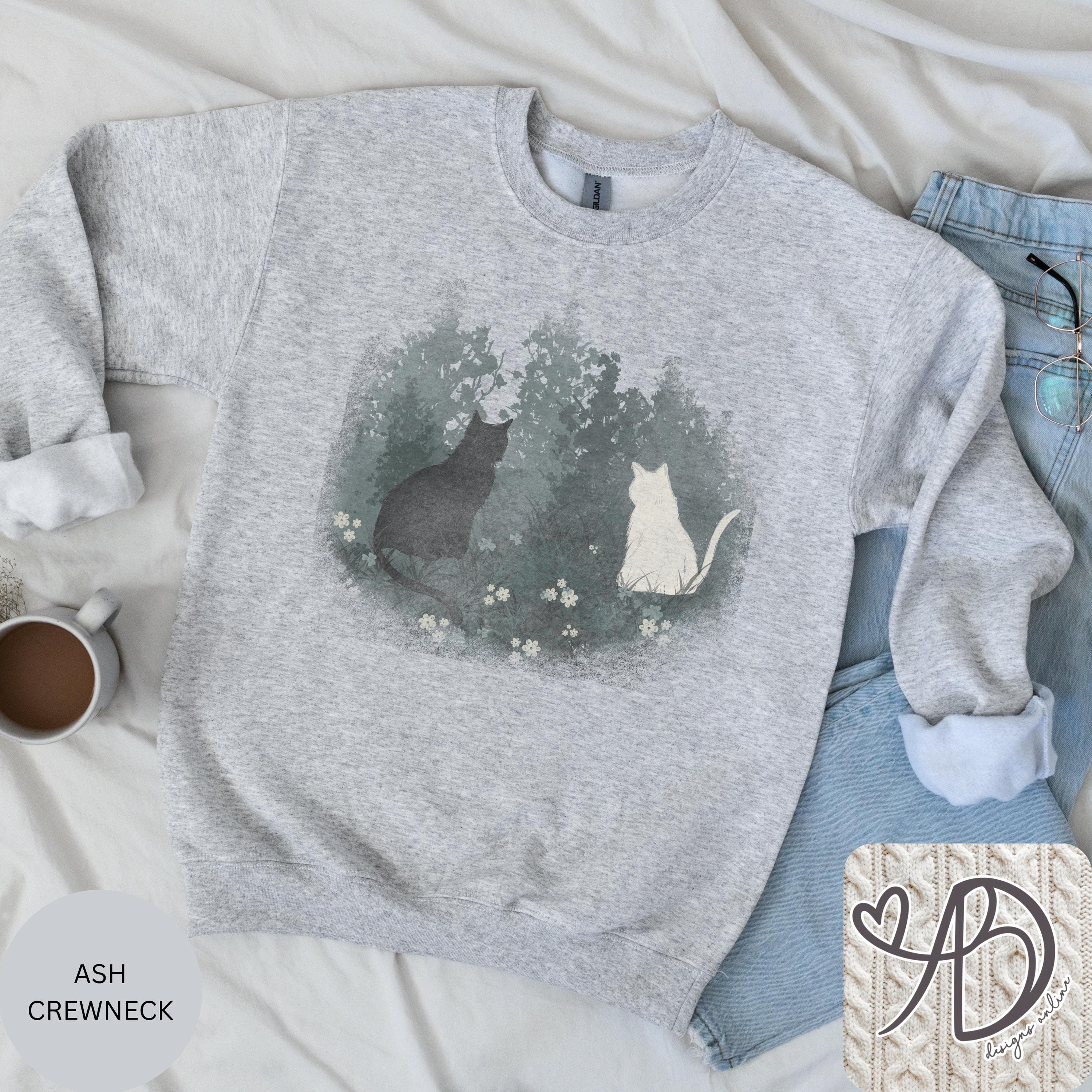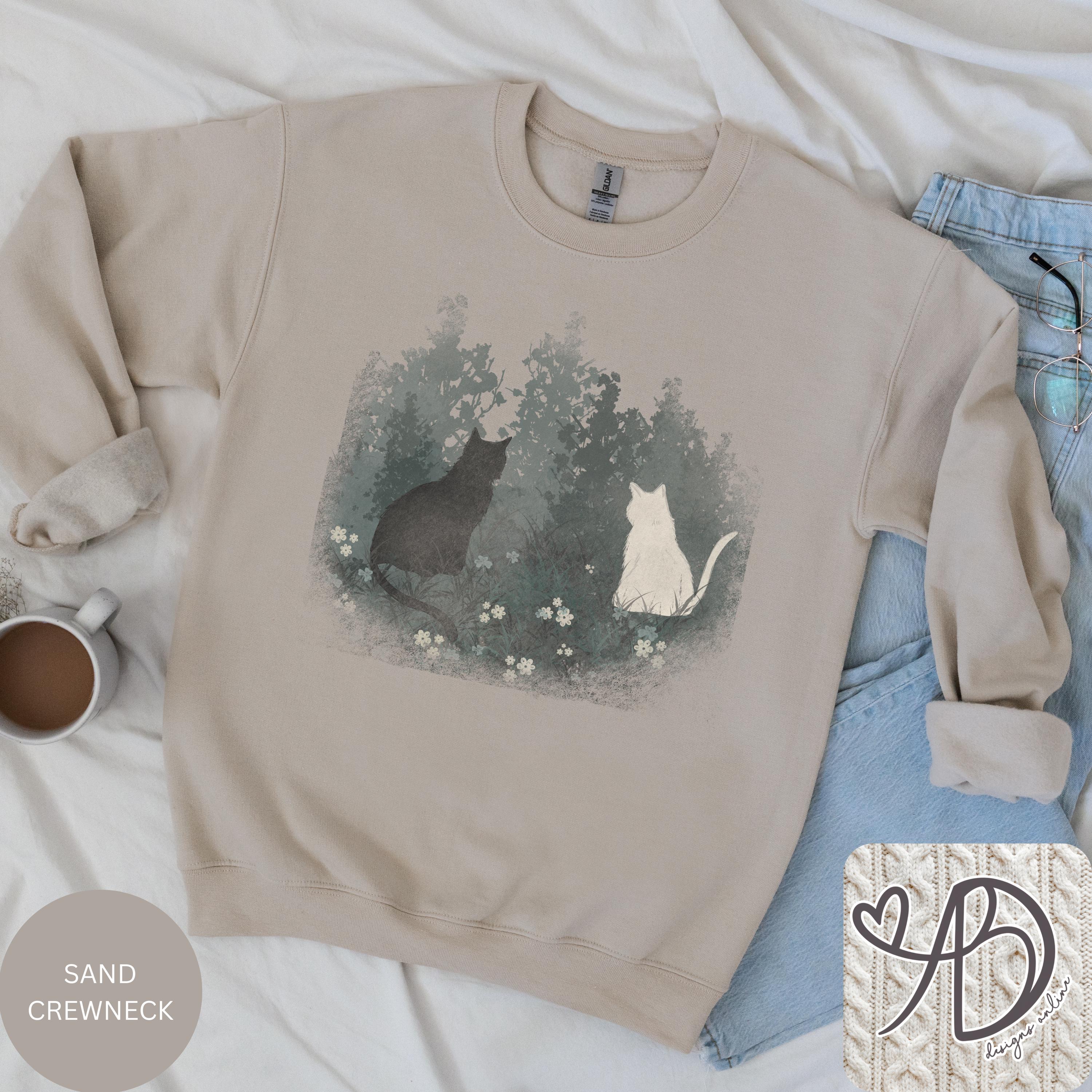 This cozy, nature-inspired sweatshirt features two cats quietly sitting together in a misty forest clearing, surrounded by soft florals and woodland textures. The design evokes a peaceful, storybook moment — perfect for cat lovers who adore cottagecore, cozy aesthetics, and quiet nature vibes.
