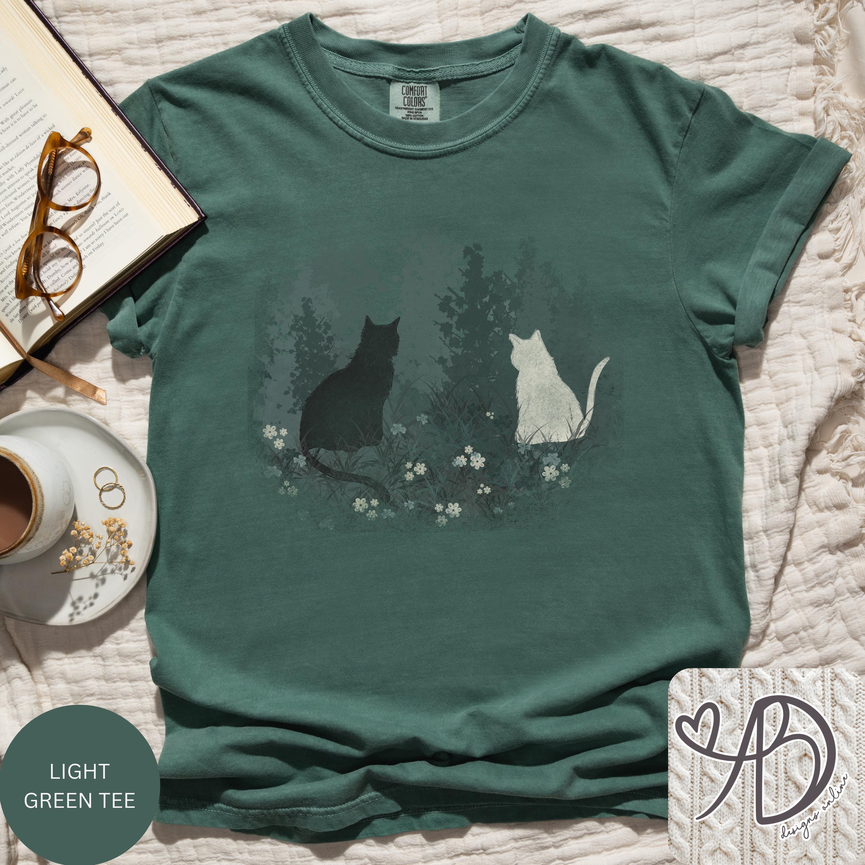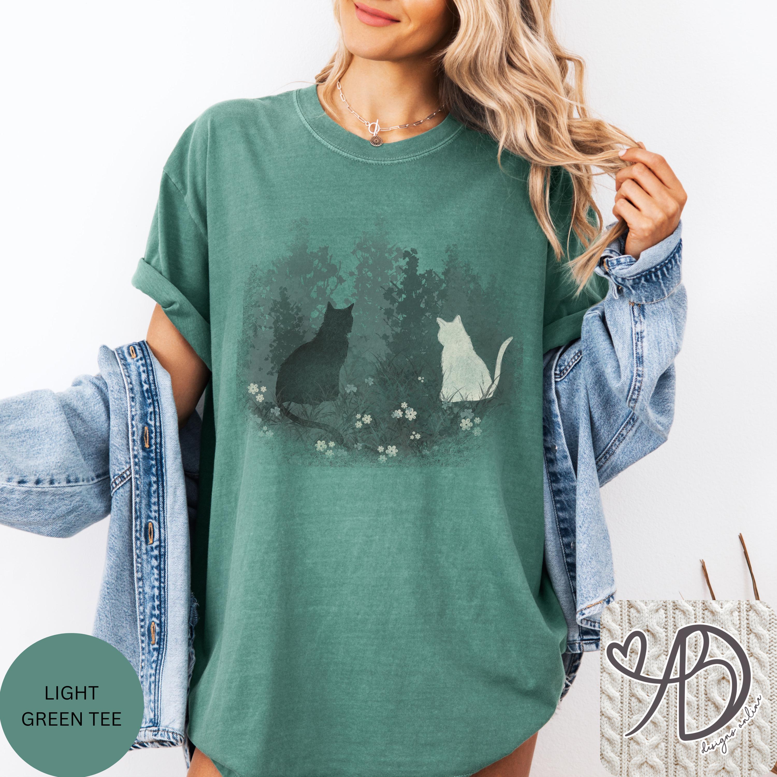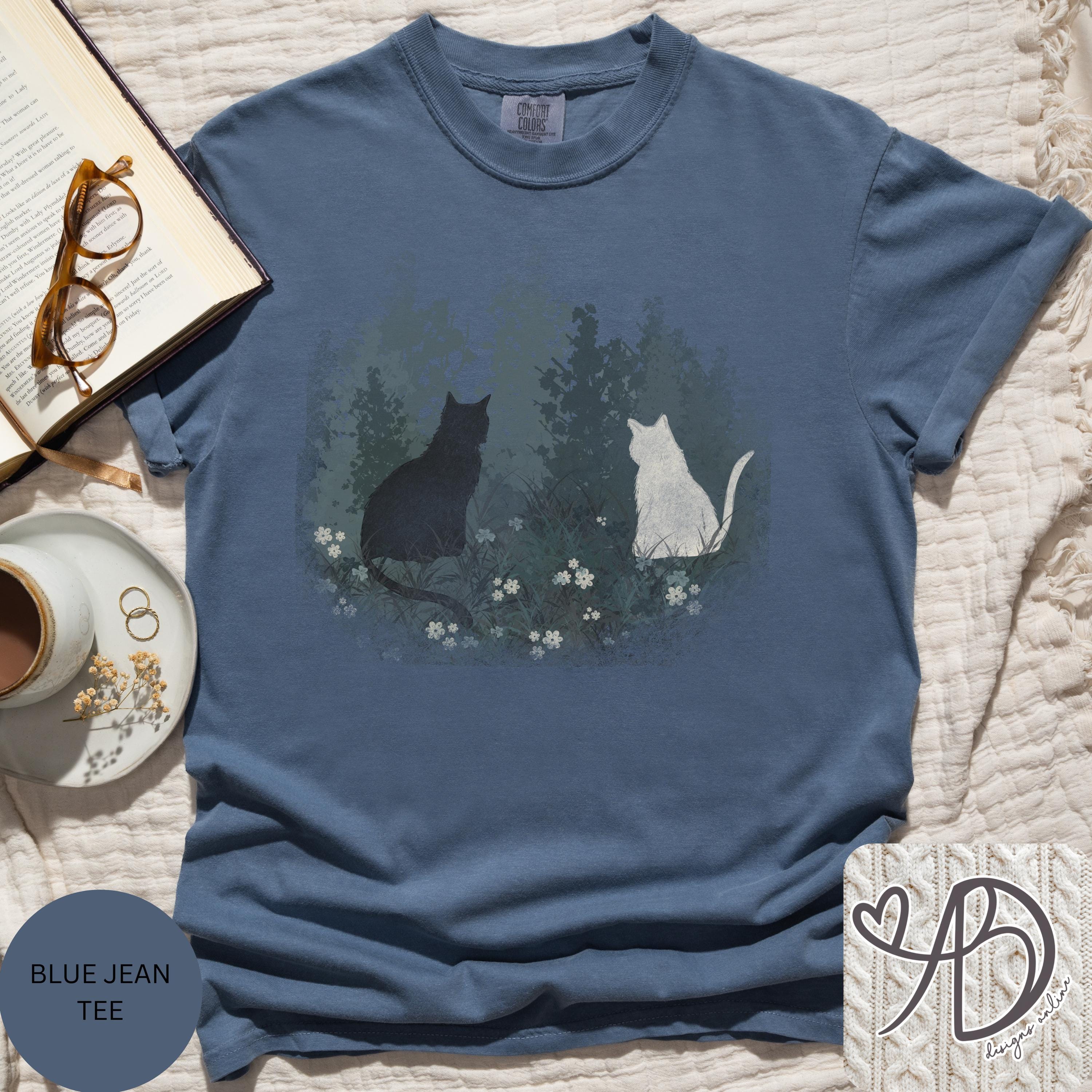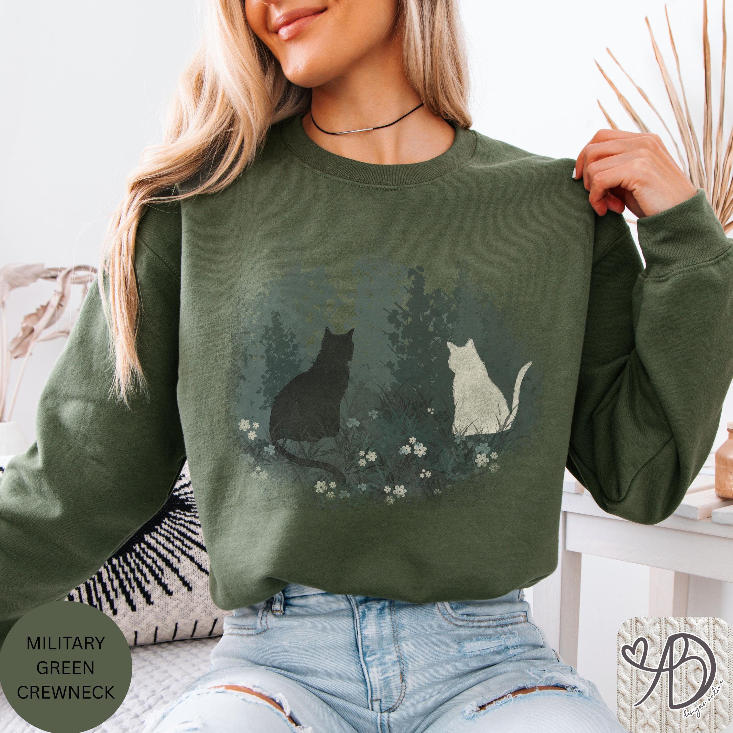 This cozy, nature-inspired sweatshirt features two cats quietly sitting together in a misty forest clearing, surrounded by soft florals and woodland textures. The design evokes a peaceful, storybook moment — perfect for cat lovers who adore cottagecore, cozy aesthetics, and quiet nature vibes.